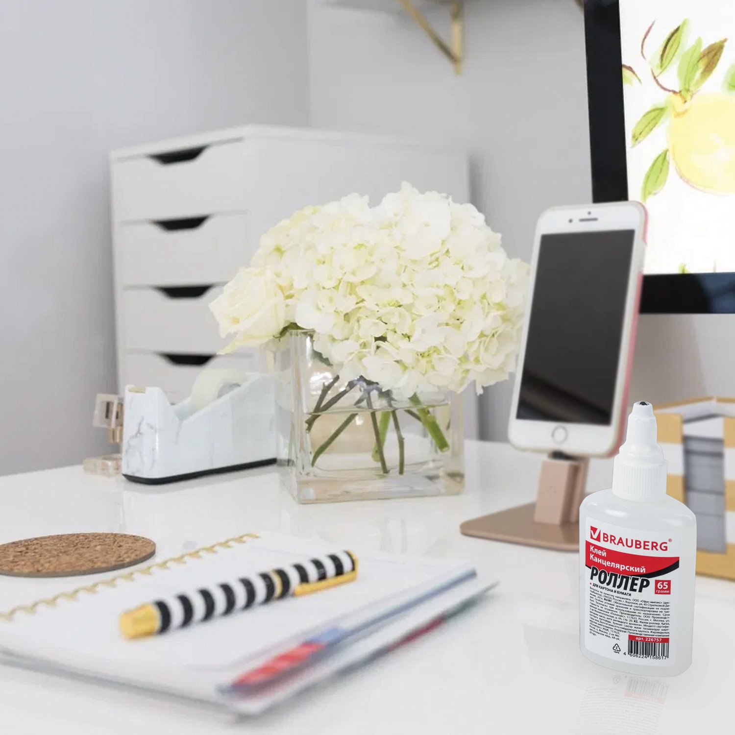 Канцелярский клей-роллер BRAUBERG без труда склеивает бумагу, картон, ткань. Незаменим в доме, школе и офисе.