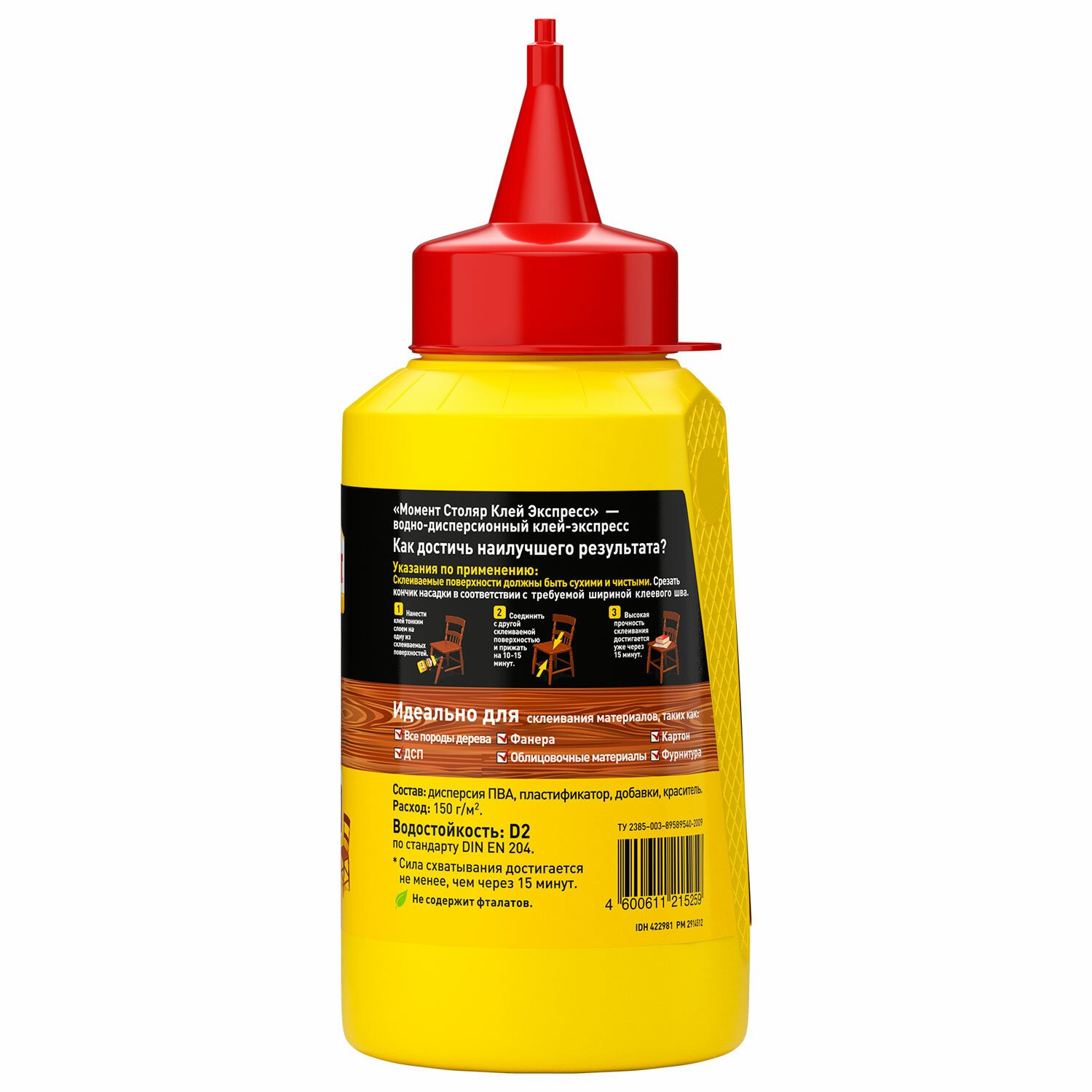 Клей СТОЛЯР предназначен для различных пород дерева. С его помощью склеивают ДСП, фанеру, шпон, ламинат, картон, фурнитуру, ткань, кожу. Надежно схватывает за 15 минут.