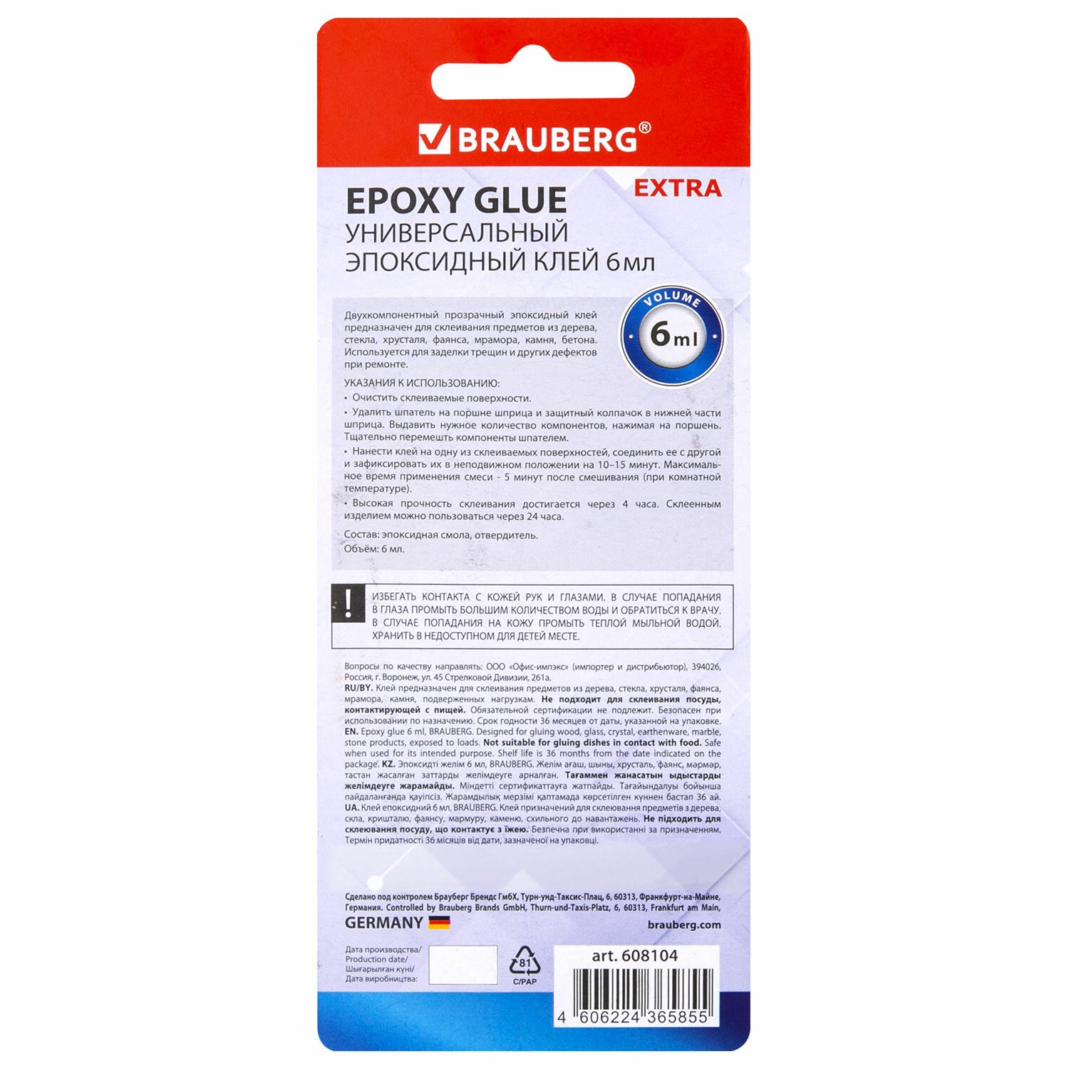 Клей универсальный эпоксидный шприц (смола+отвердитель) 3+3 мл суперпрочный, BRAUBERG EXTRA, 608104