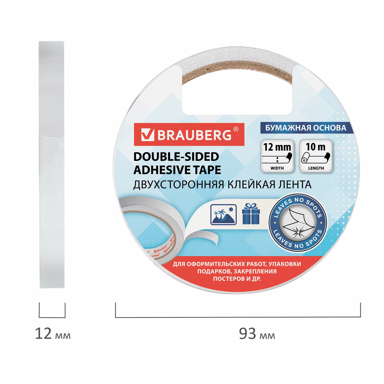 Двухсторонняя клейкая лента BRAUBERG на бумажной основе применяется для оформления, упаковки подарков, детского творчества, закрепления постеров.