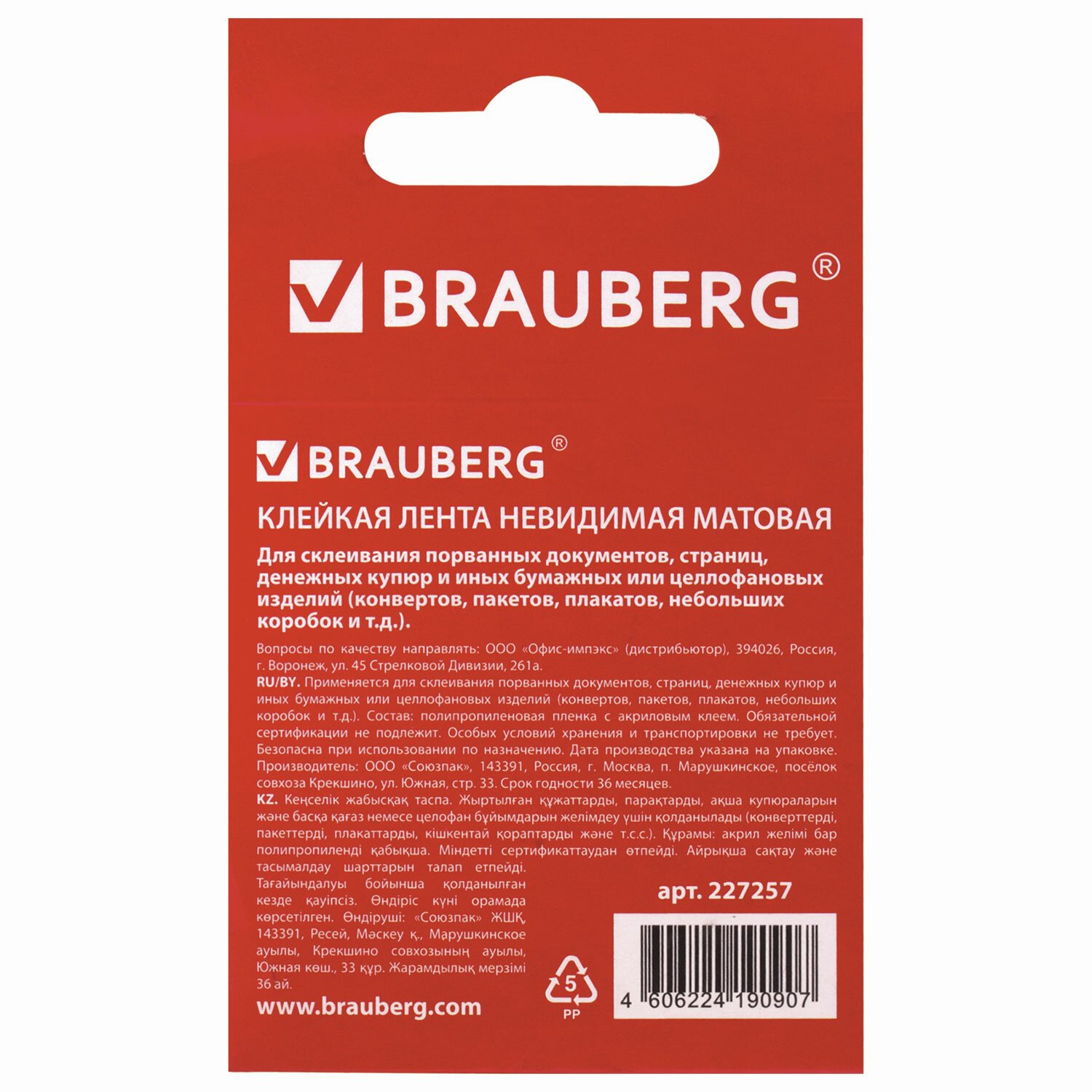 Клейкая лента невидимая, матовая, 19 мм х 33 м, BRAUBERG, 227257