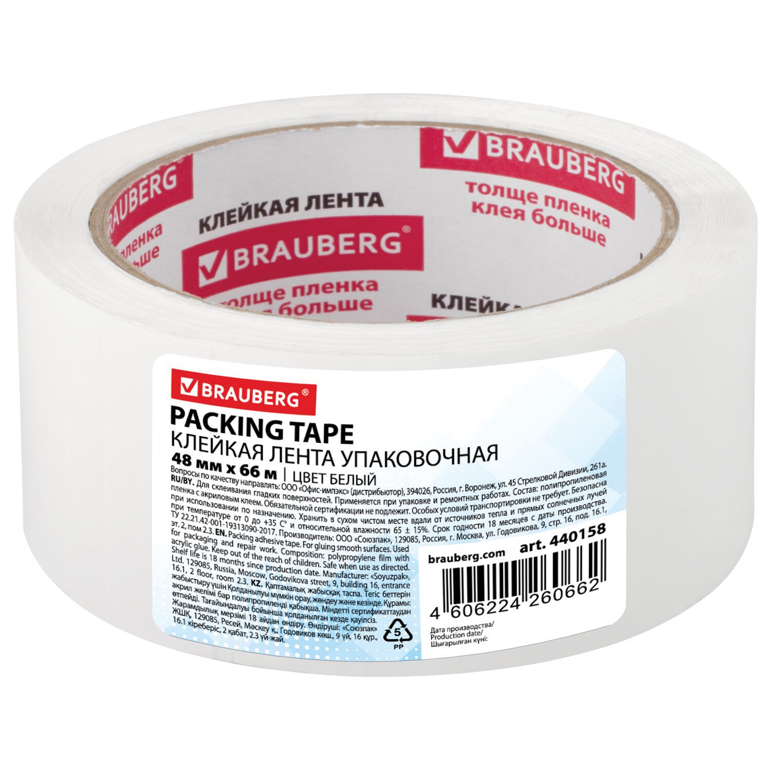 Клейкая лента упаковочная 48 мм х 66 м, БЕЛАЯ, толщина 45 микрон, BRAUBERG, 440158