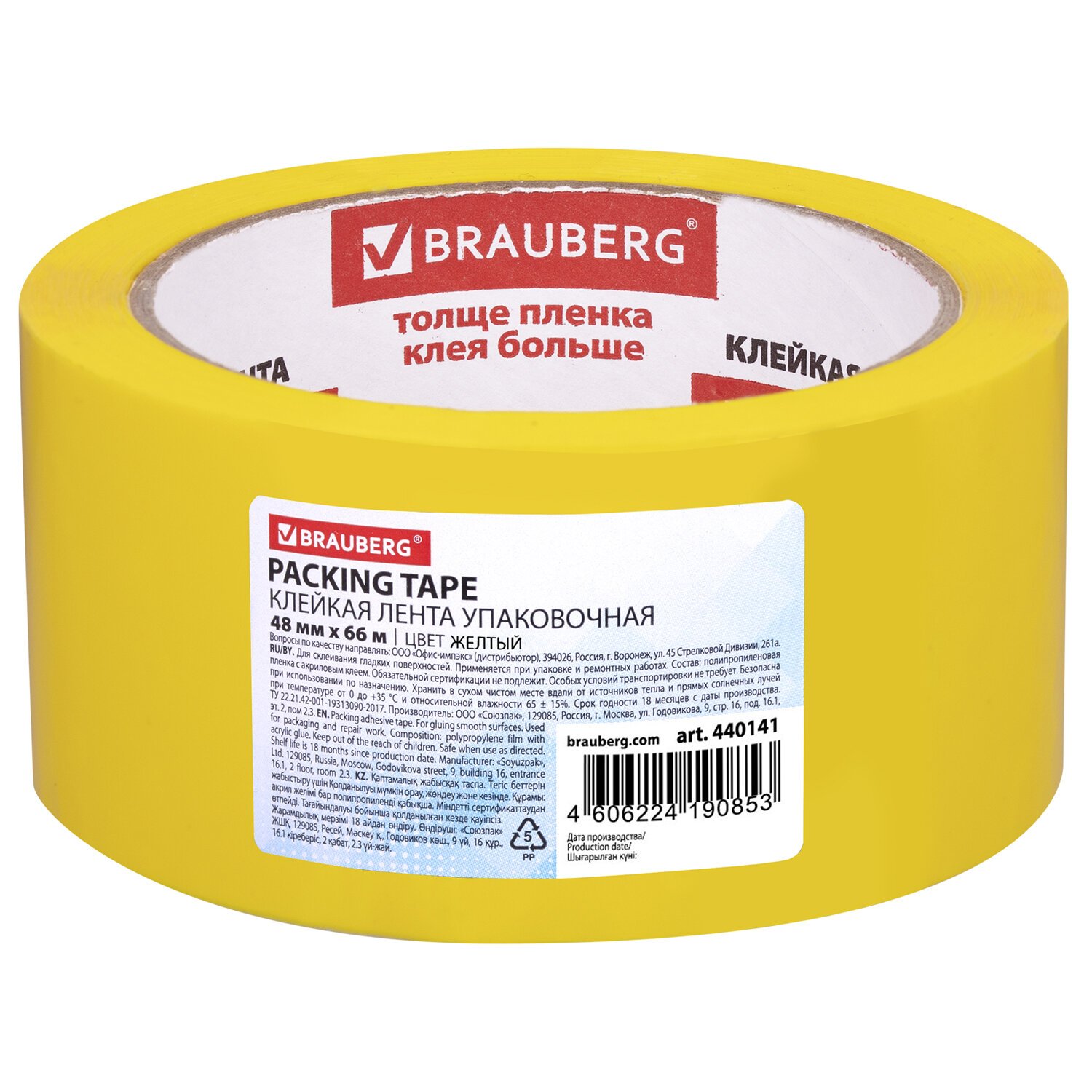 Клейкая лента упаковочная, 48 мм х 66 м, ЖЕЛТАЯ, толщина 45 микрон, BRAUBERG, 440141