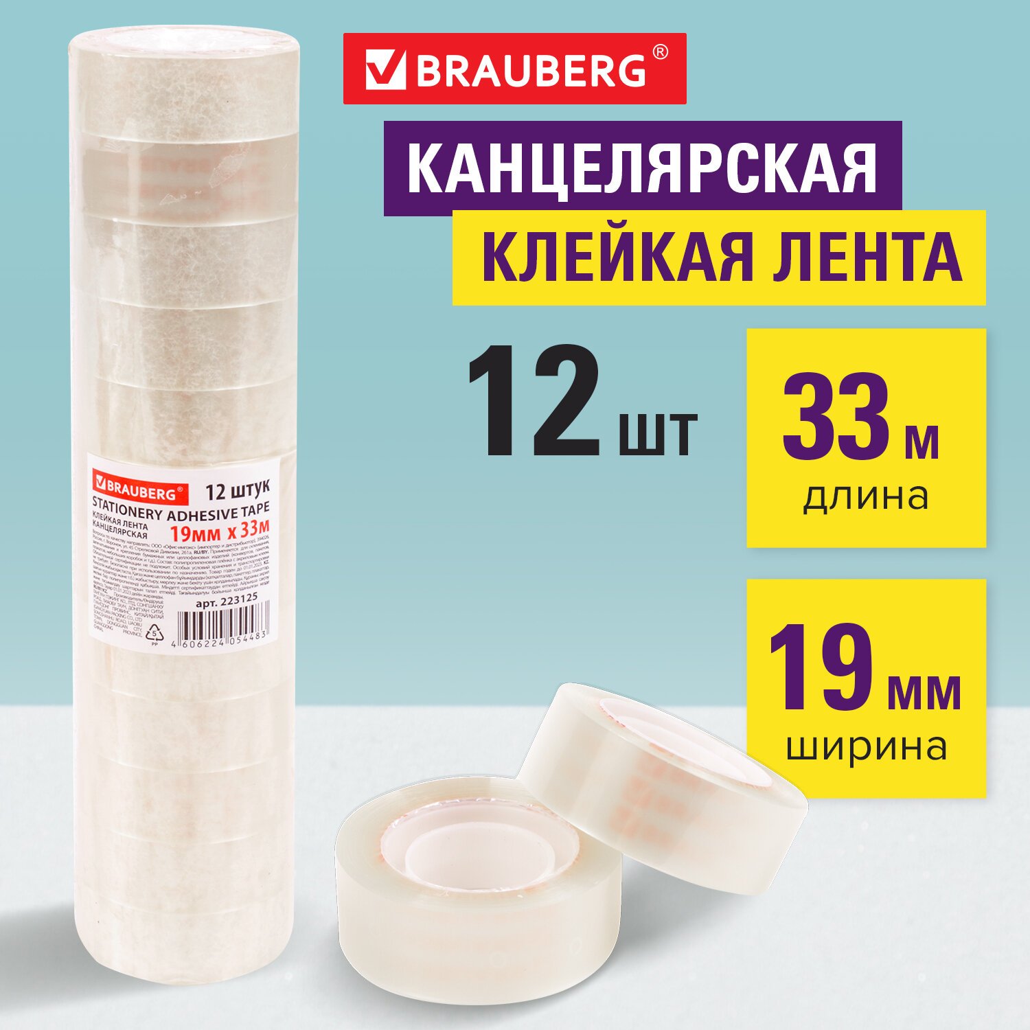 Клейкие ленты 19 мм х 33 м канцелярские BRAUBERG, комплект 12 шт., прозрачные, 223125