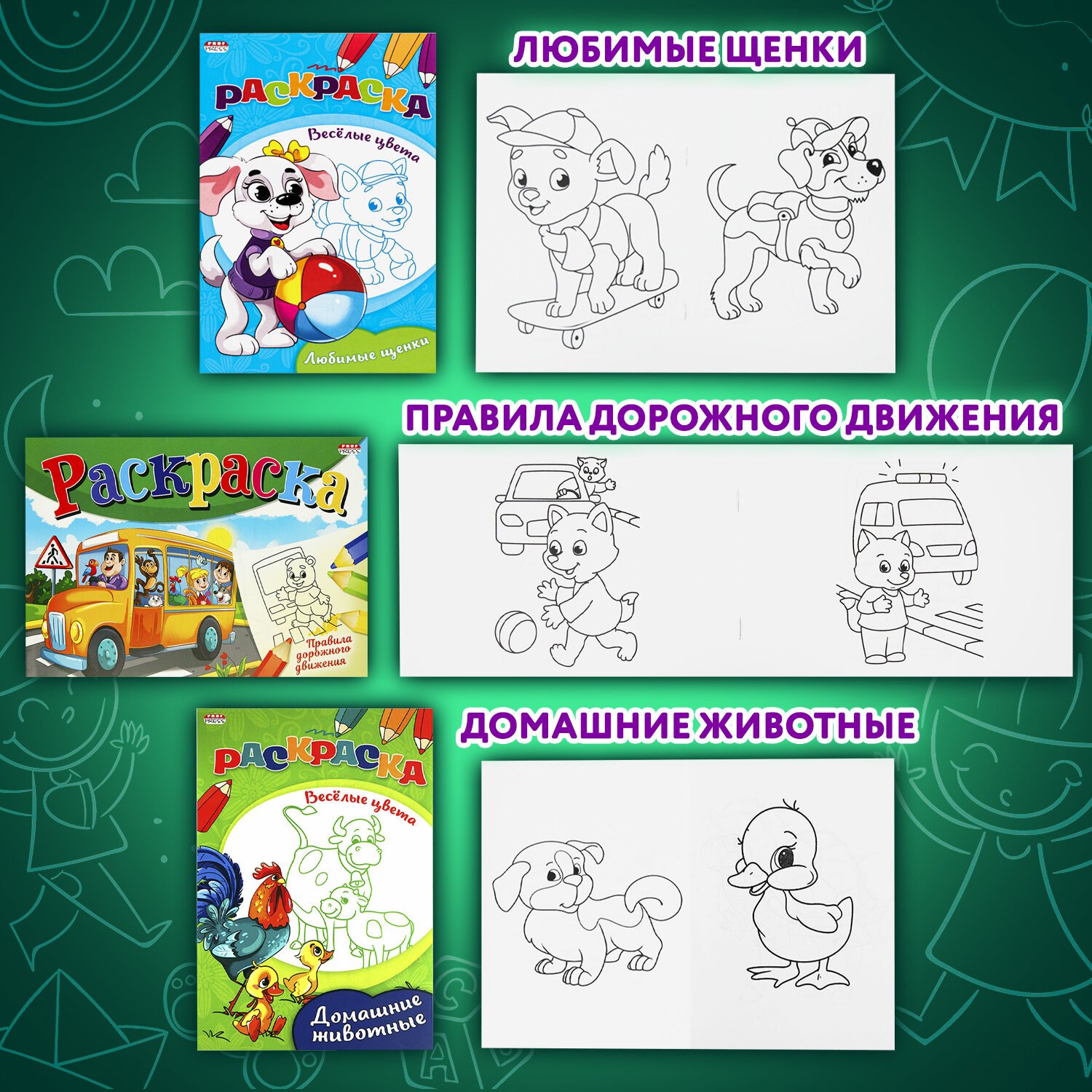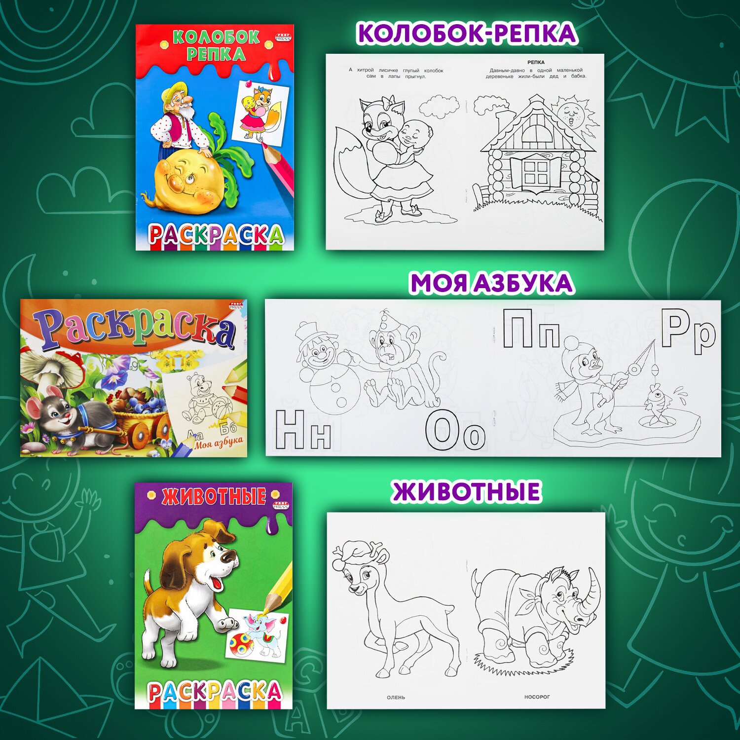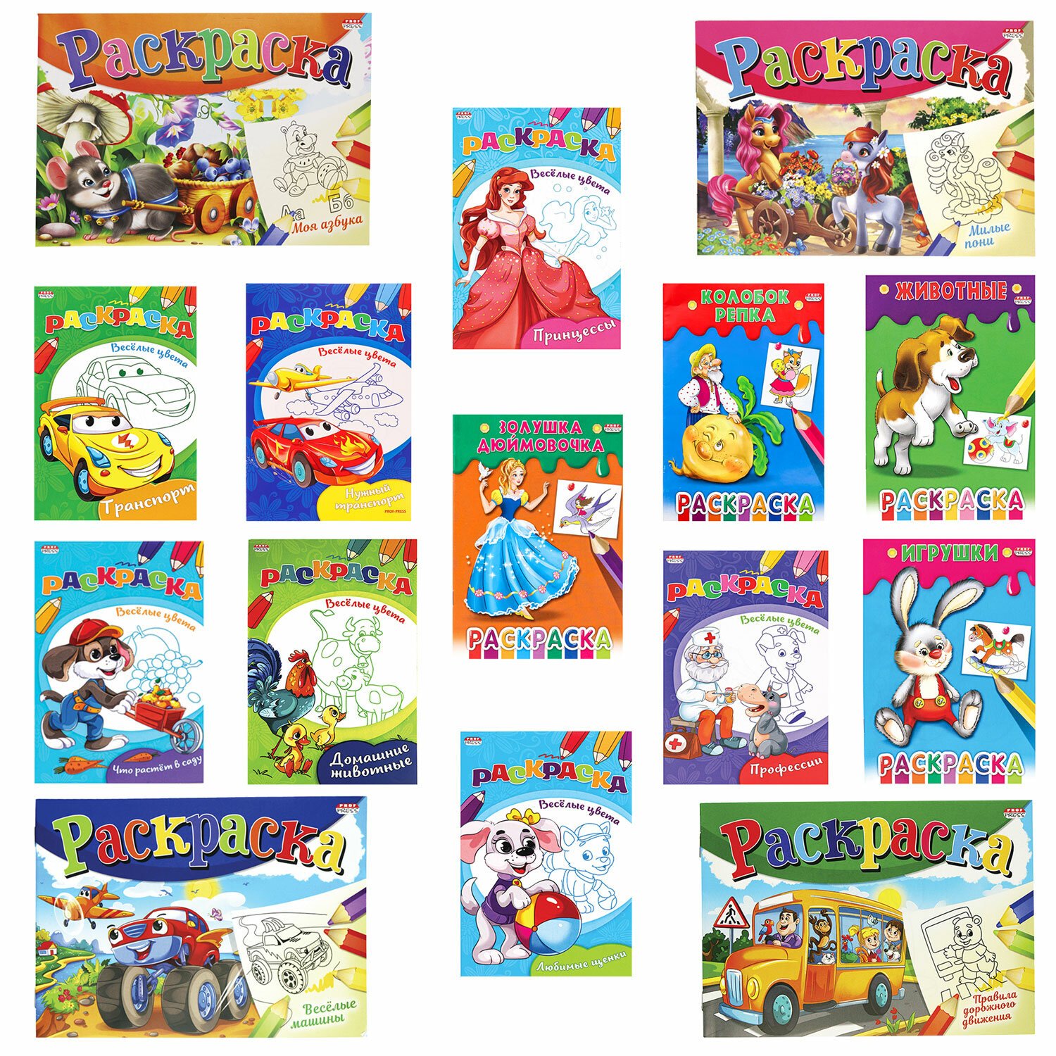 Комплект книжек-раскрасок из 15 штук с сюжетами ассорти. В наборе представлены: