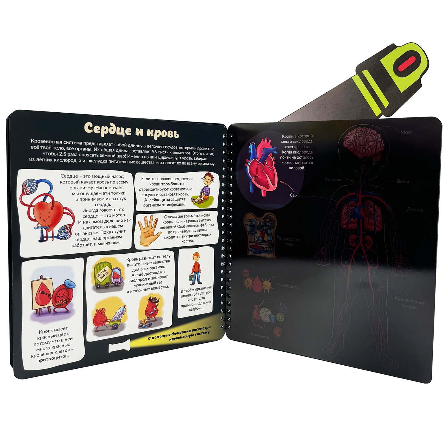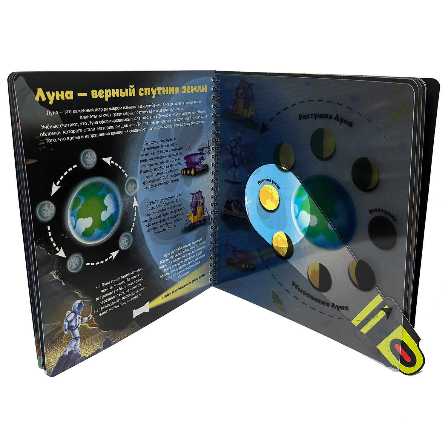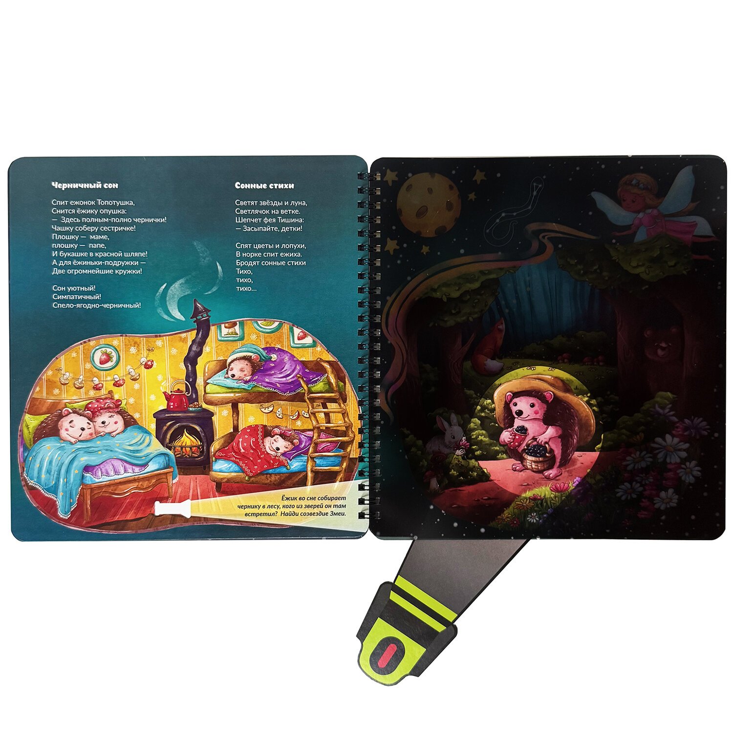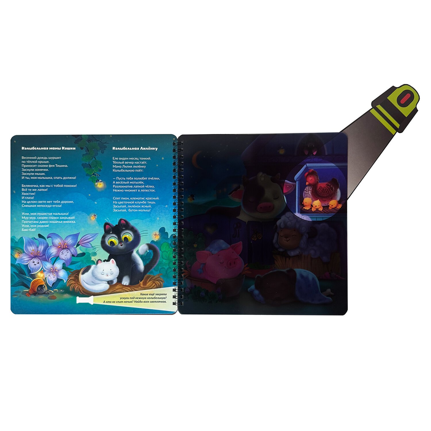 Эта увлекательная книжка не только развлечёт ребёнка, но и поможет развить логическое мышление и наблюдательность. Книжка с волшебным фонариком привлекает внимание ребёнка своей необычной задумкой. Для игры понадобится фонарик – он выполнен из картона и прикреплён к книжке на шнурке. Как разглядеть предметы на чёрных страницах книжки? - Возьмите фонарик и вложите его между пластиковой и чёрной страницами. - Вы получите яркое изображение на пластиковой странице, где размещаете белую часть фонарика (луч). - Остальные части страницы (не под фонариком) остаются в тени.