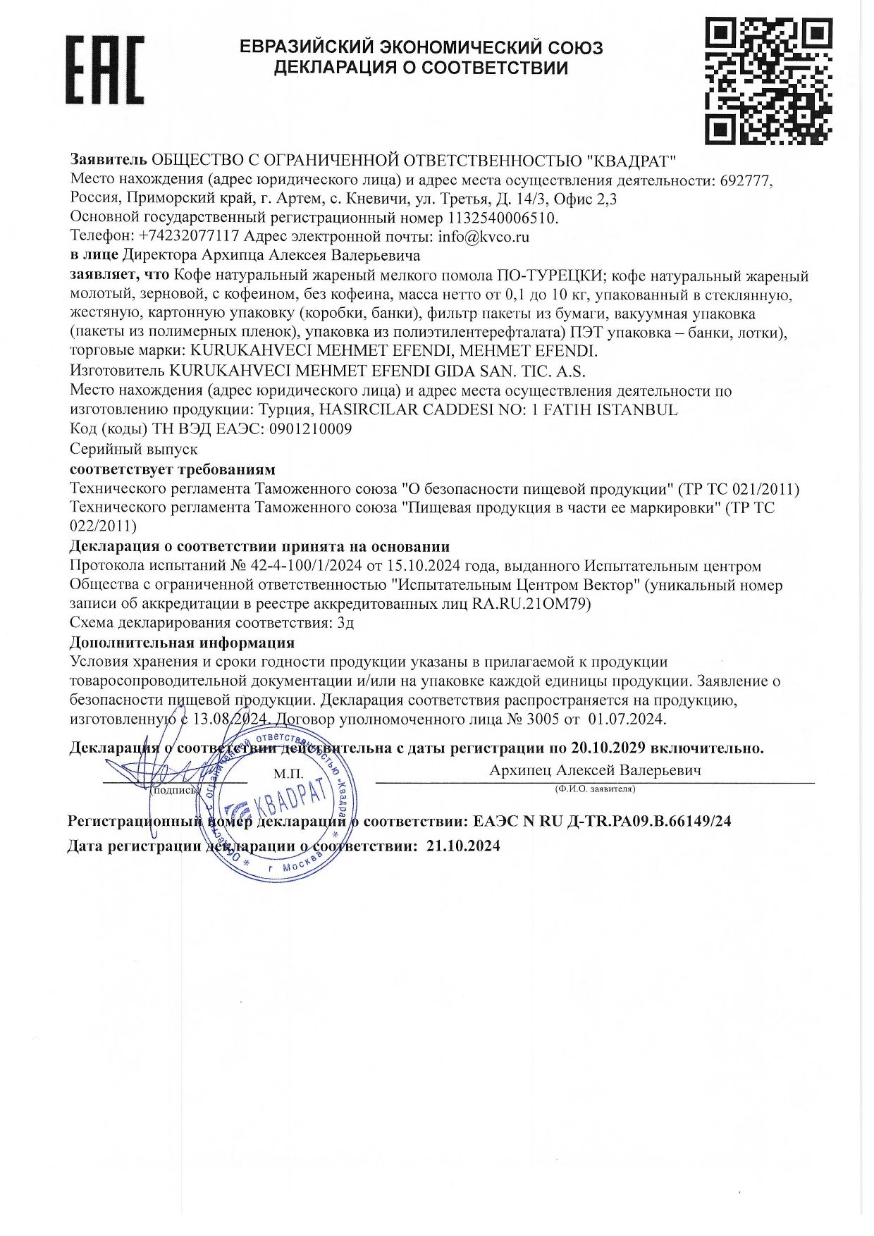 | Фирма-производитель | Курукахвеси Мехмет Эфенди Гида Сан. Тик. А. С. |