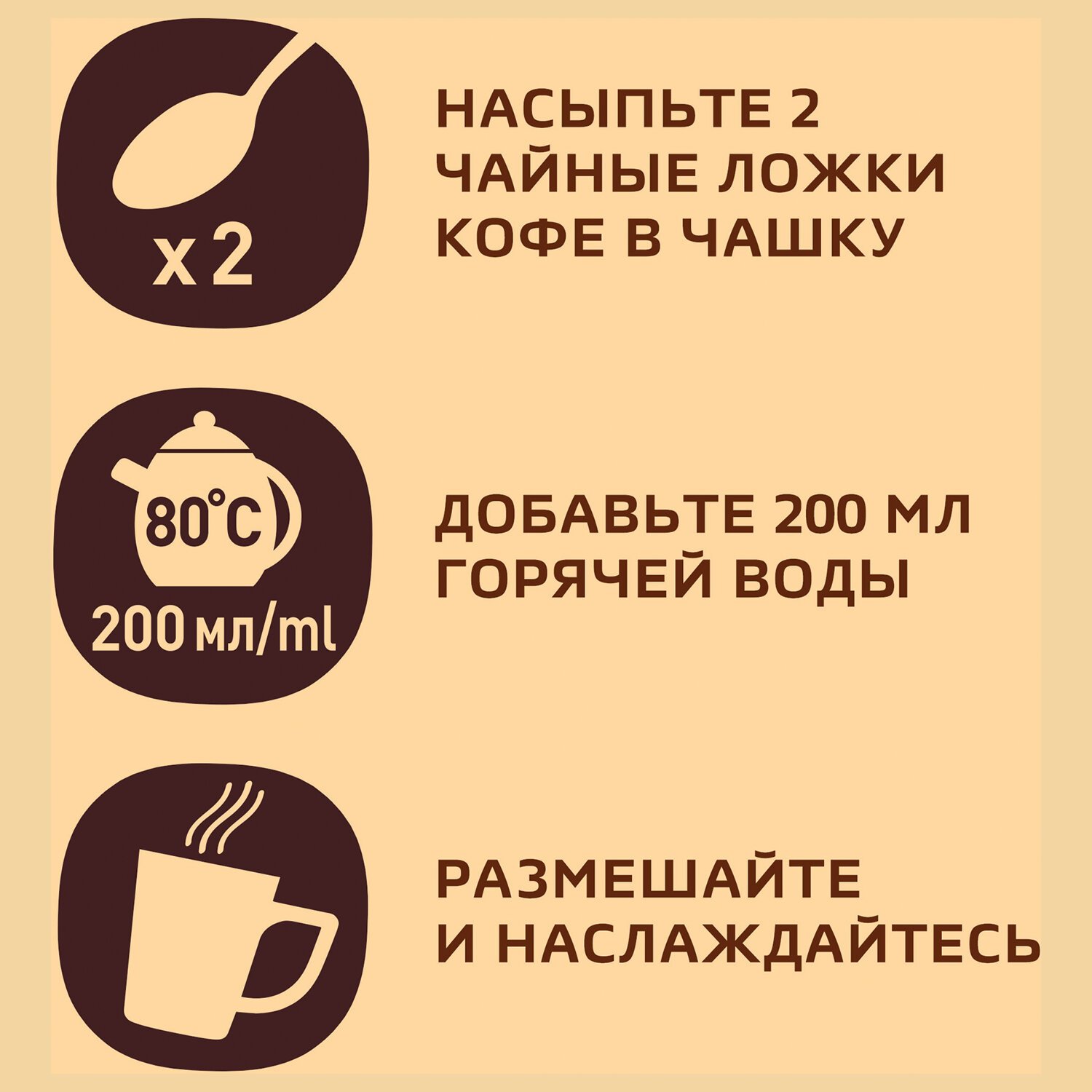 Рекомендации по приготовлению/использованию: положите 2 чайные ложки кофе в чашку, залейте 200 мл горячей, но не кипящей воды. По желанию добавьте сахар, молоко или сливки. Рекомендуем употребить продукт в течение 70 дней после вскрытия упаковки.