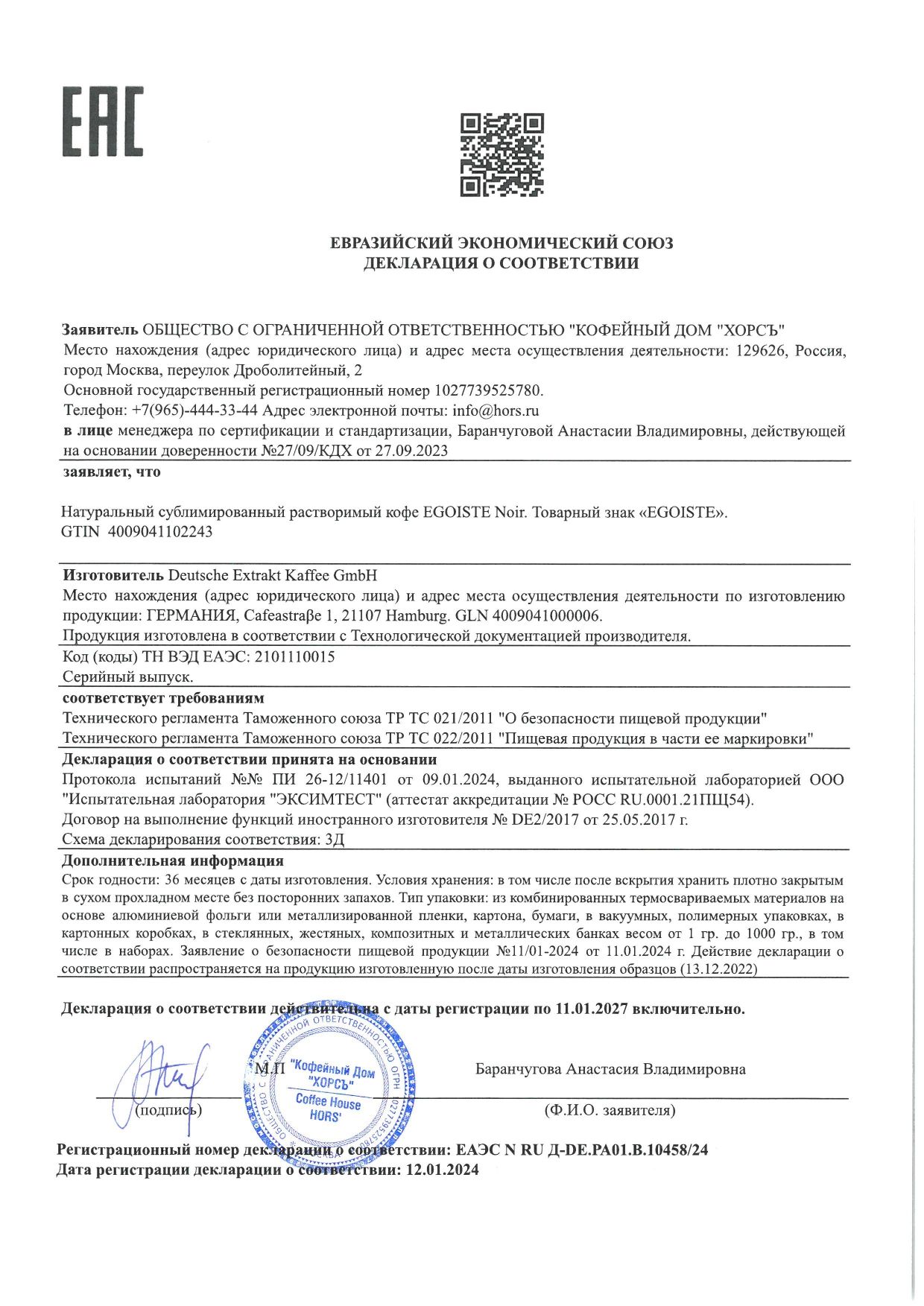 Кофе растворимый EGOISTE "Double Espresso", ШВЕЙЦАРИЯ, сублимированный, 100 г, стеклянная банка, EG10012023