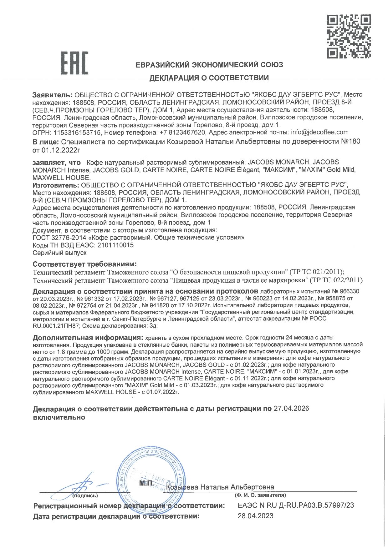 Кофе растворимый MONARCH Gold, сублимированный, 500 г, мягкая упаковка, ш/к 71678