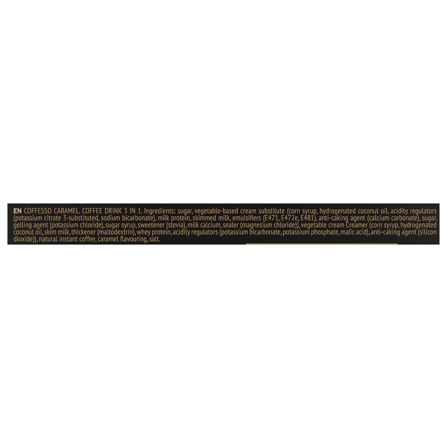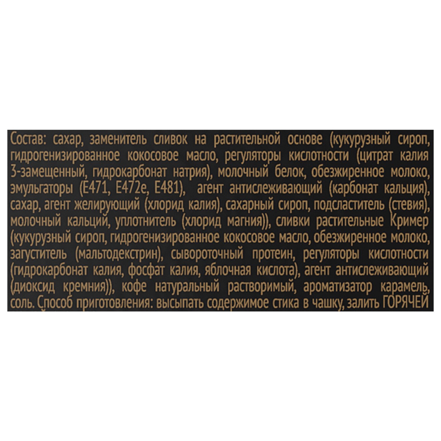 Состав: сахар, заменитель сливок на растительной основе, кофе натуральный растворимый, ароматизатор "Карамель", соль.