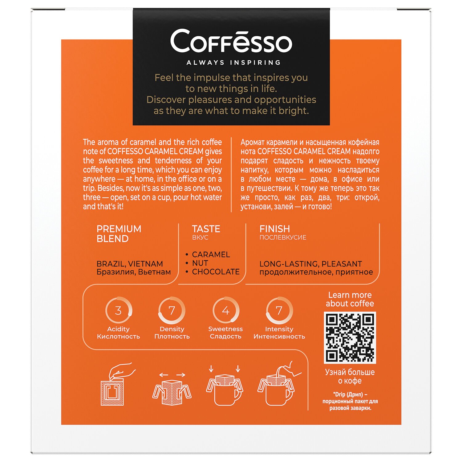 COFFESSO "Caramel Cream" обладает прекрасным ароматом и нежным вкусом с карамельными нотками. Кофе, которыми можно насладиться везде: дома, в офисе или в путешествии. Это так просто, как раз, два, три: открой, установи, залей – и готово!