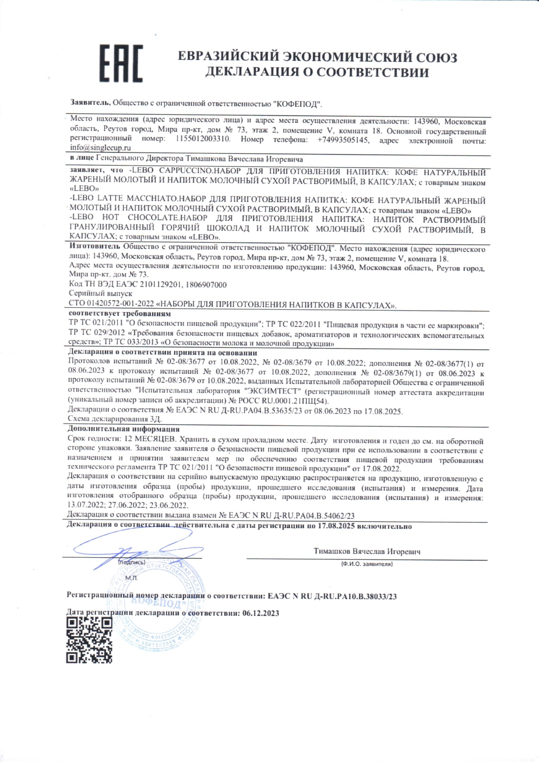 | Вид напитка | кофе в капсулах |