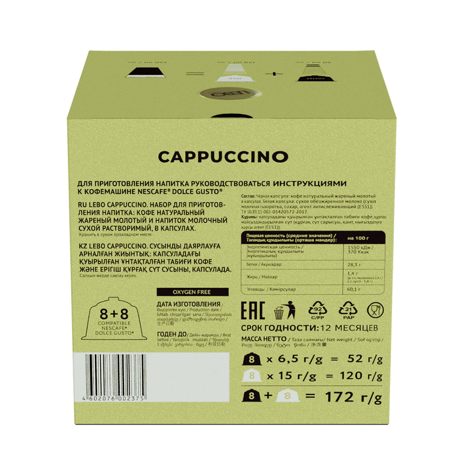 Кофе в капсулах LEBO "Cappuccino" для кофемашин Dolce Gusto, 8 порций (16 капсул)
