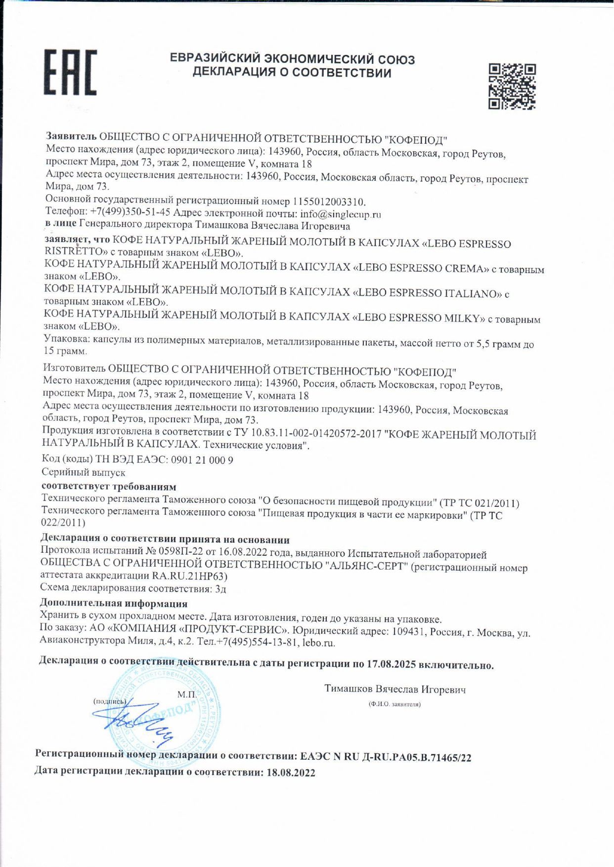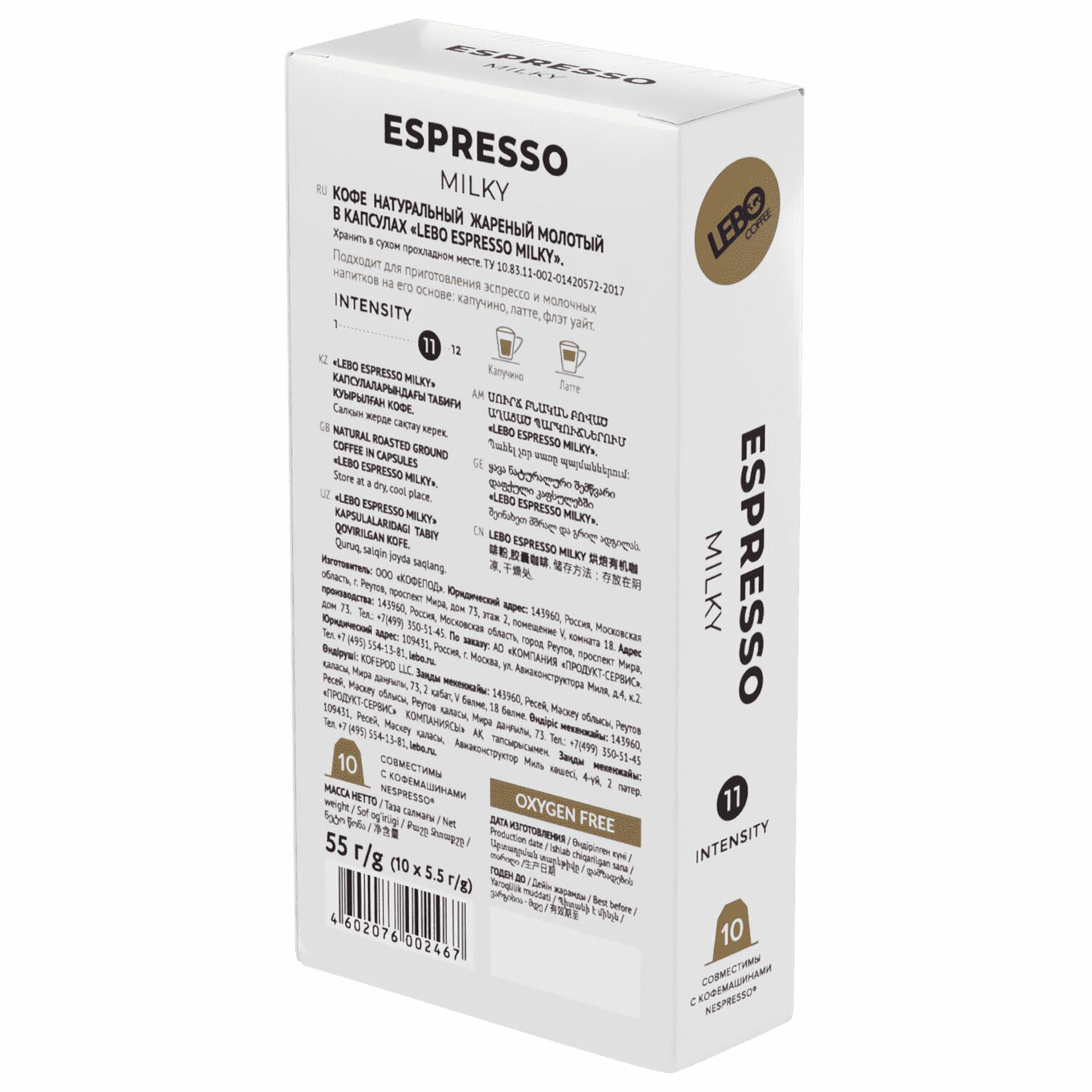Кофе в капсулах LEBO "Espresso Milky" для кофемашин Nespresso, 10 порций