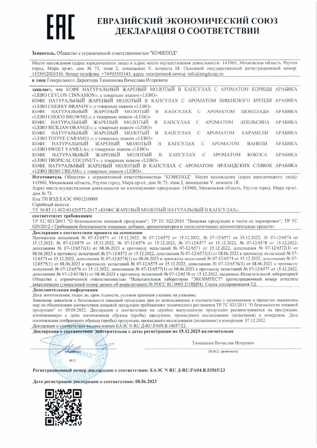 Кофе в капсулах LEBO "Irish Cream" для кофемашин Nespresso – современный способ насладиться вкусом отборных свежемолотых зерен арабики.