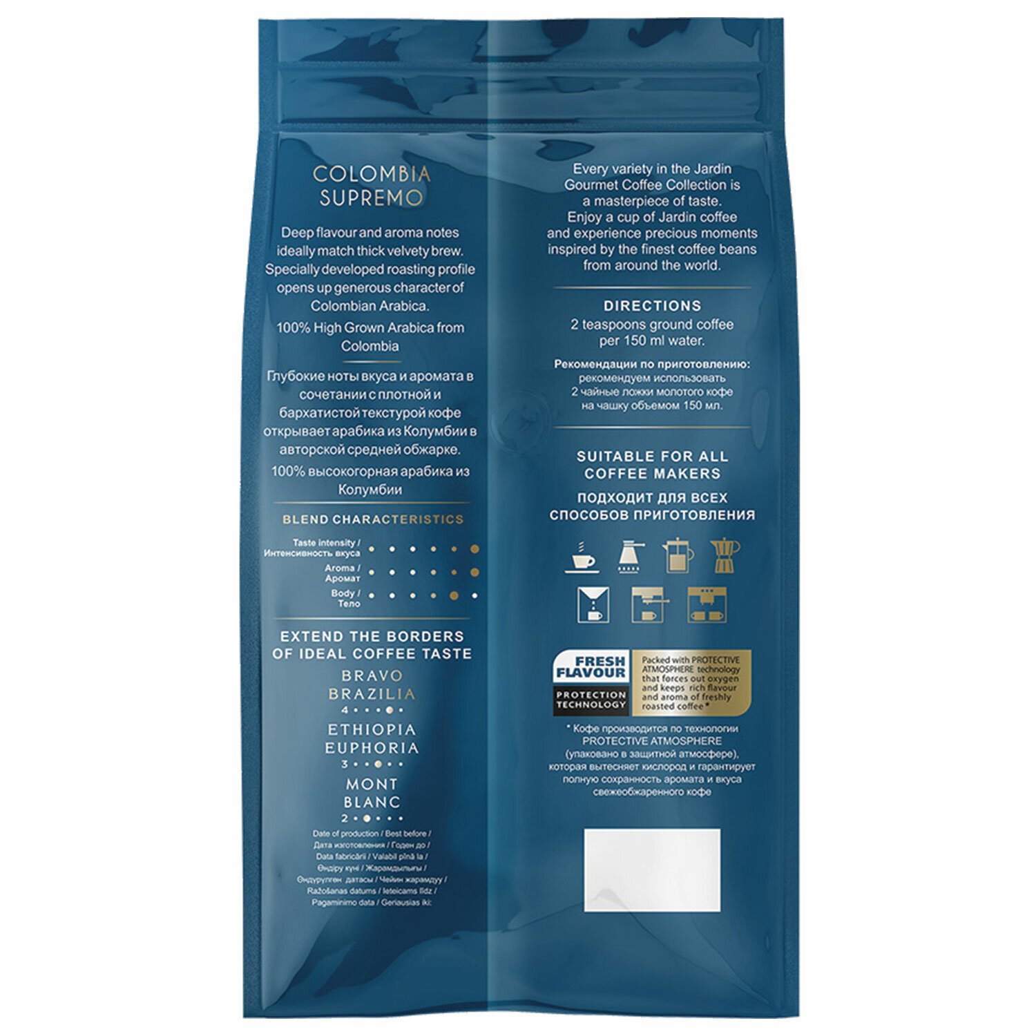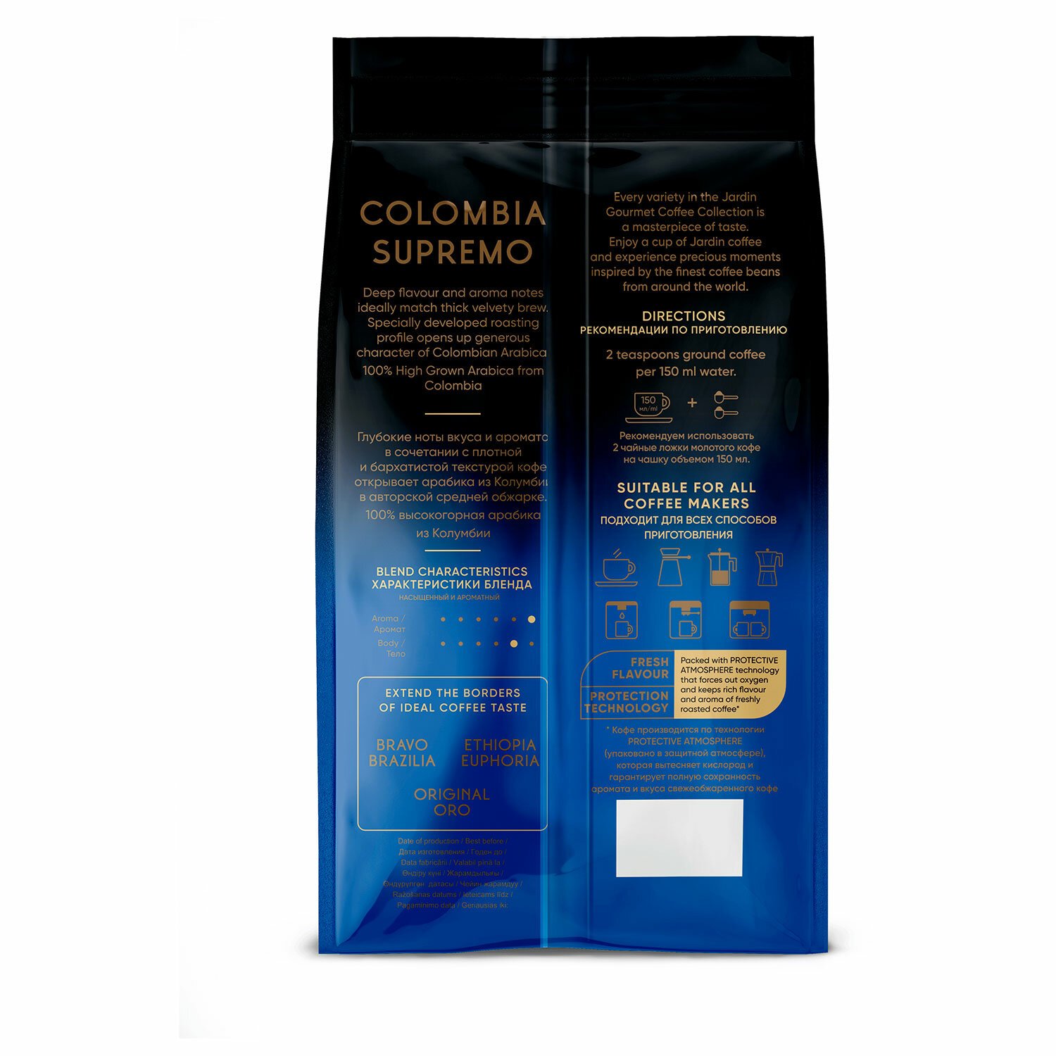 Знаменитая арабика из Колумбии, выращенная на высокогорных плато древних Анд, открывает плотный, бархатистый вкус с деликатной нотой горького шоколада. Уникальный профиль темной обжарки создает великолепный аромат – насыщенный и яркий.