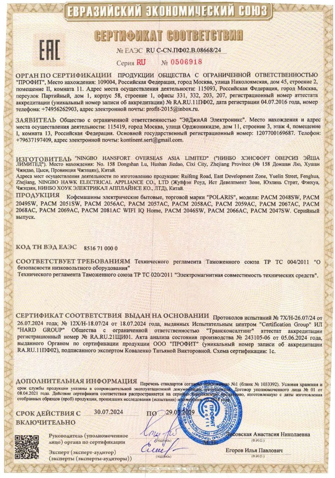 Кофемашина POLARIS PACM 2047SW, 1450 Вт, объем 1,8 л, автокапучинатор, белая, 81404