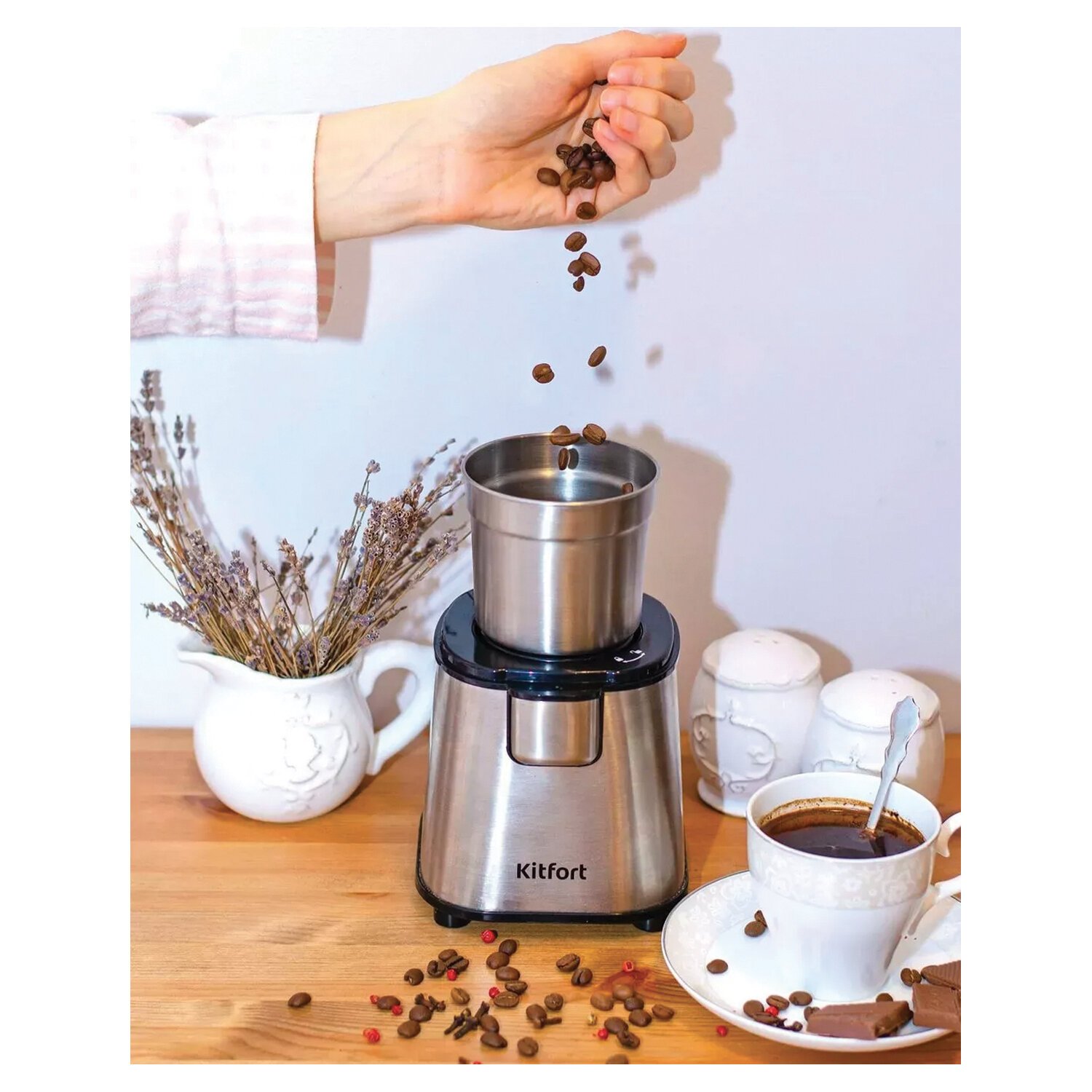Чтобы иметь возможность каждое утро наслаждаться ароматом свежесваренного кофе, нужно иметь под рукой кофемолку электрическую Kitfort KT-1315.