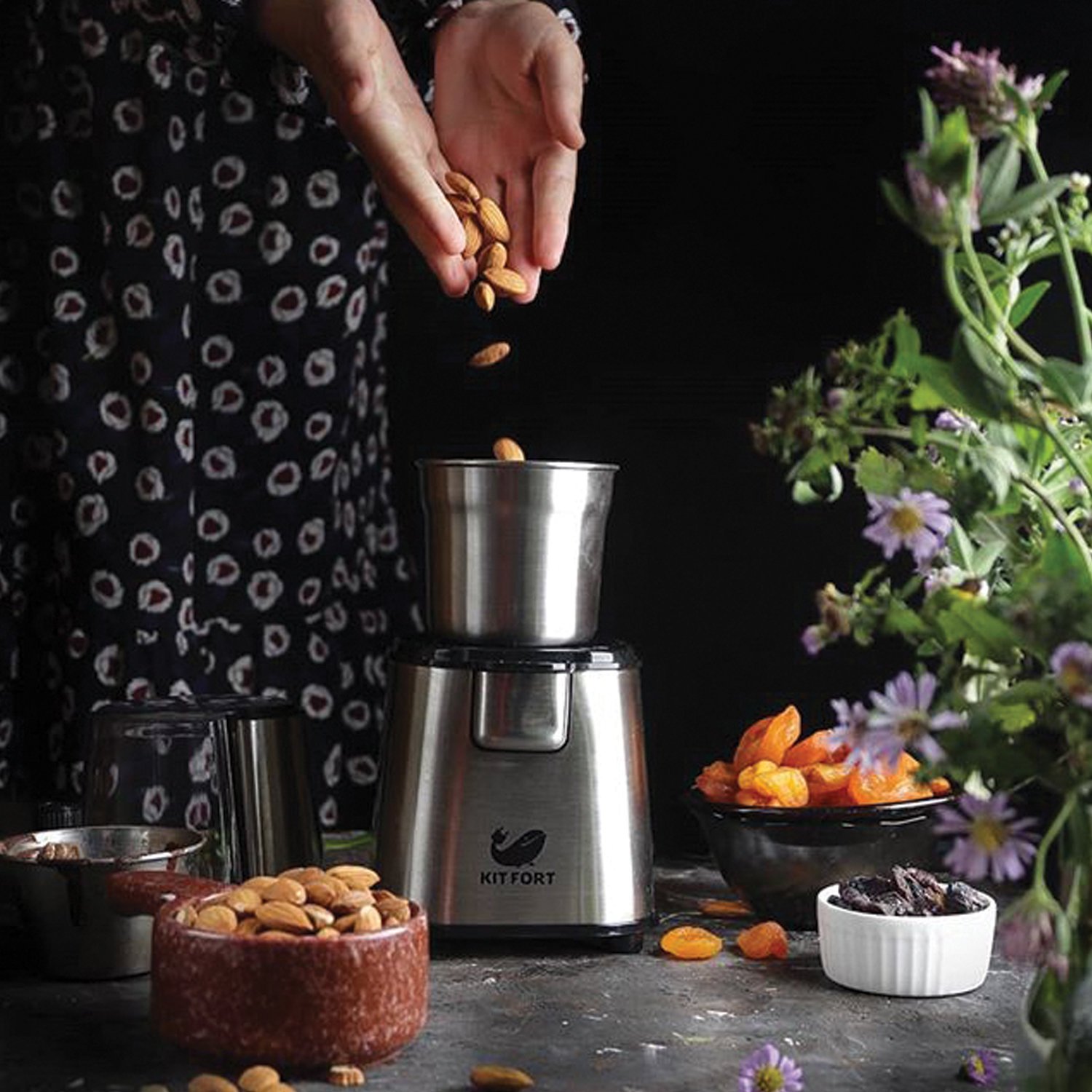 Kitfort KT-1315 предусматривает наличие металлической съемной чаши, что обеспечивает комфорт эксплуатации и долговечность устройства. Для измельчения кофемолка использует ротационный нож. Кофемолка выполнена в серебристом корпусе и обладает мощностью 180 Вт. Импульсный режим гарантирует мгновенный перемол продукта. На таком устройстве можно измельчать не только кофейные зерна: прибор подойдет для измельчения орехов, семян, специй, а также грубых круп, которые можно будет использовать для приготовления каши маленькому ребенку.
