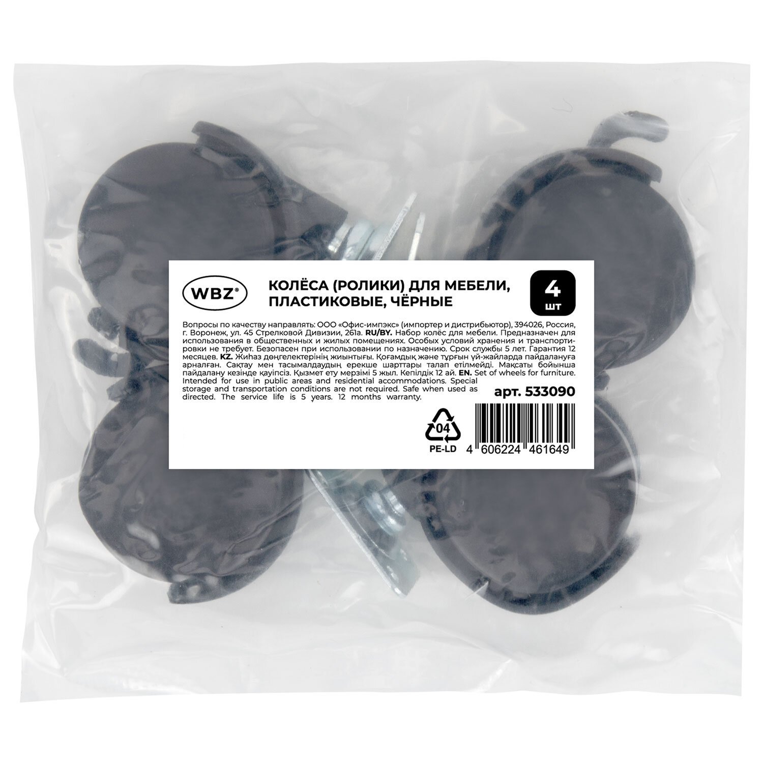 Колеса (ролики) для мебели, пластиковые d35мм, КОМПЛЕКТ 4шт, черные, в пакете, WBZ, 533090