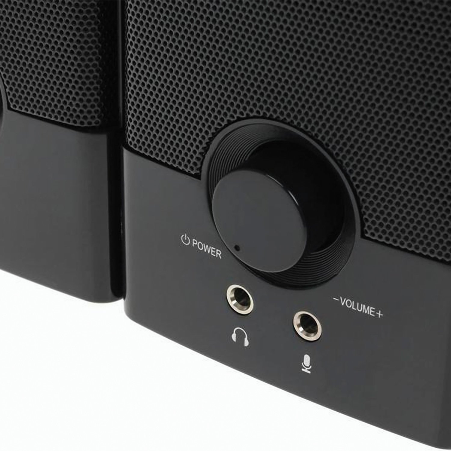 На переднюю панель акустики вынесены разъемы для наушников и микрофона – для подключения дополнительного устройства не нужно тянуться к системному блоку, все под рукой и не требует лишних усилий.