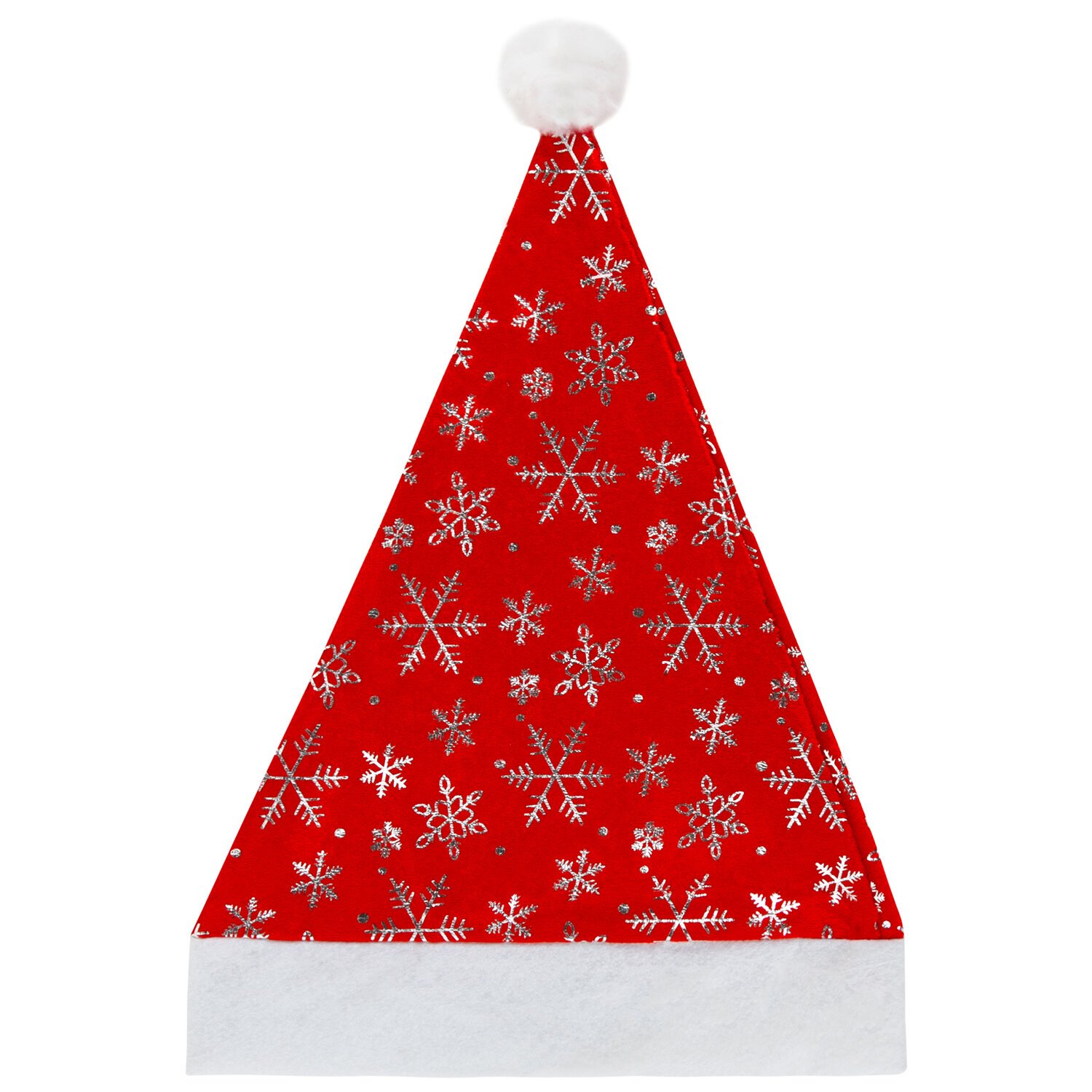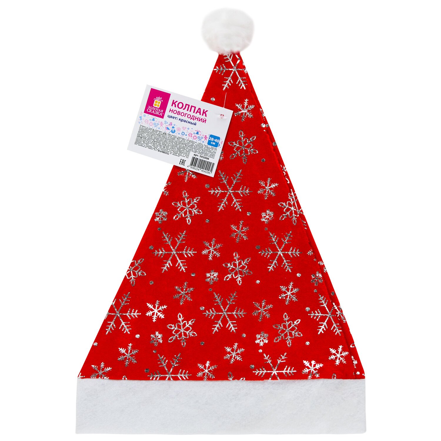Колпак новогодний шириной 28 см и высотой 40 см украшен серебристыми снежинками. Материал – двухслойная ткань из полиэстера красного и белого цветов в форме треугольника. Сверху на колпаке есть помпон белого цвета.