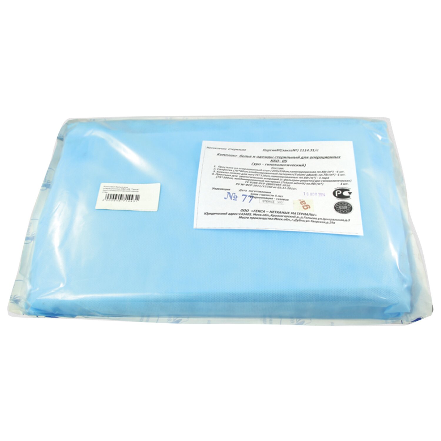 Стерильный комплект белья и одежды предназначен для длительных операций и операций с большим количеством отделяемых жидкостей. Простыни для ограничения операционного поля из прочного влагонепроницаемого материала с высокой впитывающей способностью. Дополнительно укомплектован простынями из влагонепроницаемого материала для инструментального и операционного стола.