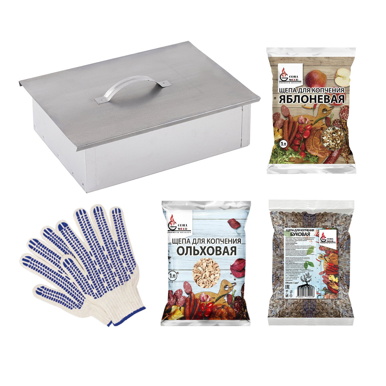 КОМПЛЕКТ для копчения, ВЫГОДНАЯ УПАКОВКА, коптильня одноярусная + щепа 3шт + перчатки, 881197