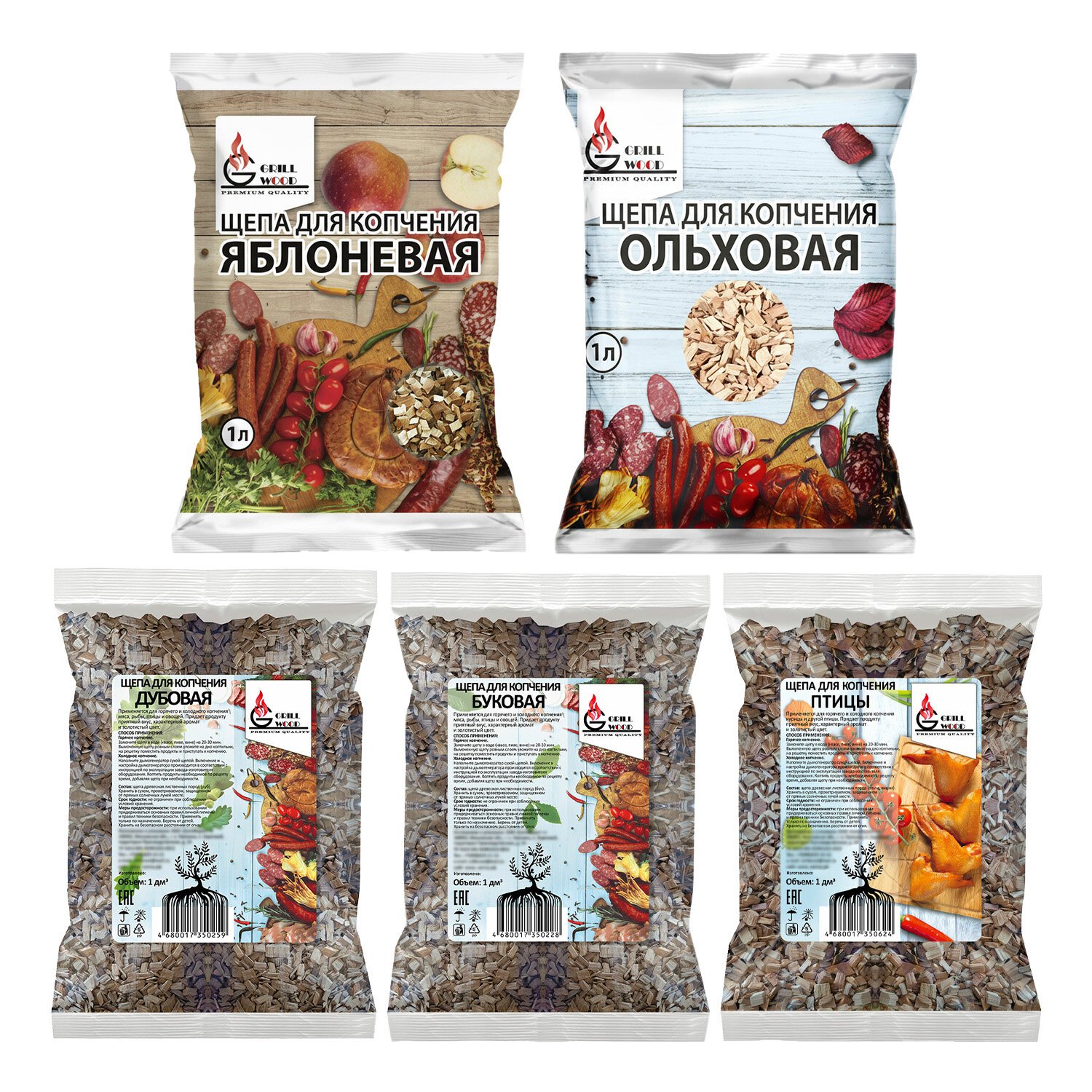 КОМПЛЕКТ щепы для копчения, ВЫГОДНАЯ УПАКОВКА, 5в1, Ольха, Бук, Яблоня, Дуб, Птица, 881195