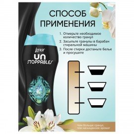 Добавьте кондиционер для белья прямо в барабан стиральной машины перед началом стирки. Гранулы мгновенно растворяются даже в холодной воде, проникая в каждое волокно ткани и делая ее более эластичной. Рекомендуется использовать 13,5 г на стирку до 5 кг белья. Интенсивность аромата можно регулировать, изменяя количество кондиционера в гранулах.