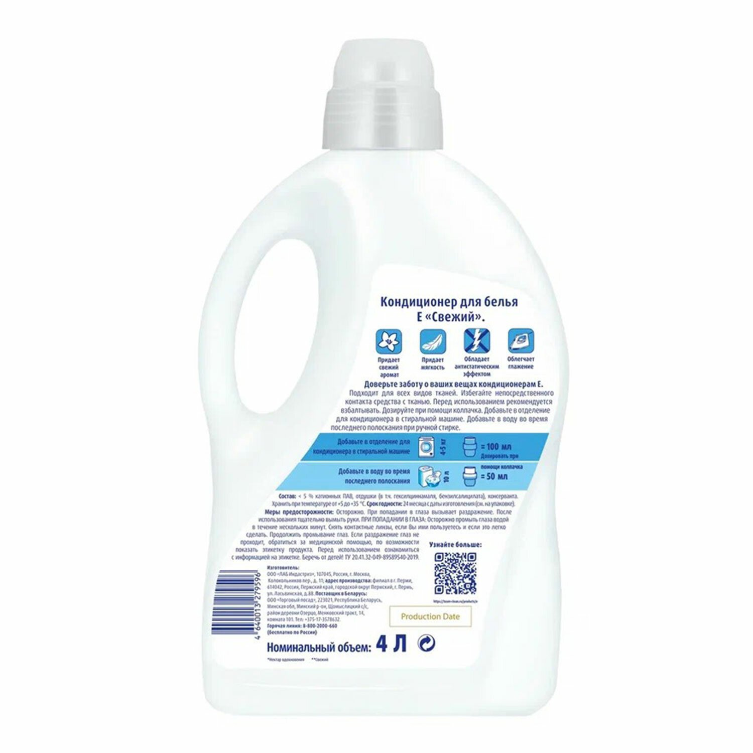 Кондиционер-ополаскиватель E "Свежий" обеспечивает свежесть белья, придает ему приятный аромат и мягкость, облегчает глажку и обладает антистатическим эффектом.