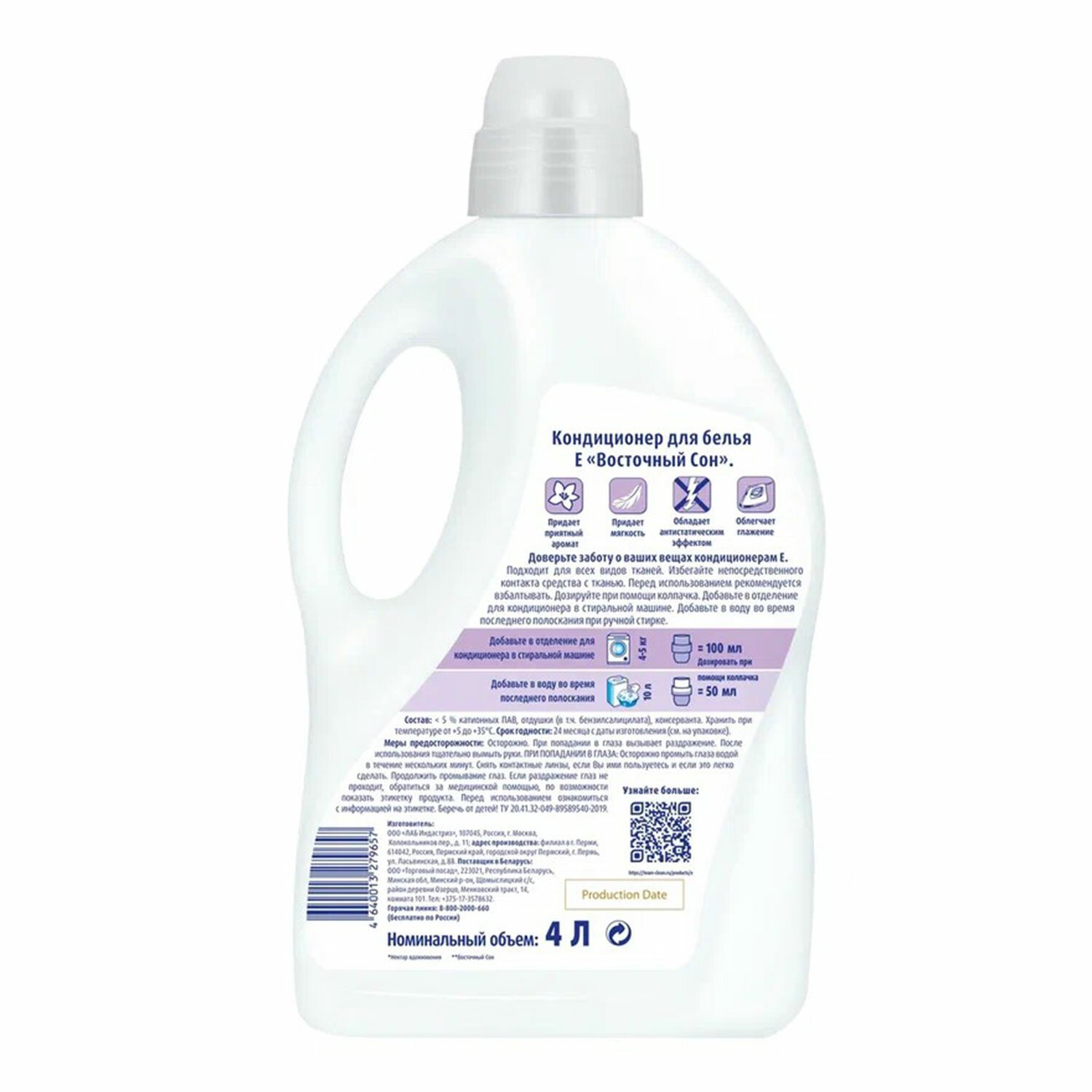 Кондиционер-ополаскиватель E "Восточный сон" обеспечивает свежесть белья, придает ему приятный аромат и мягкость, облегчает глажку и обладает антистатическим эффектом.