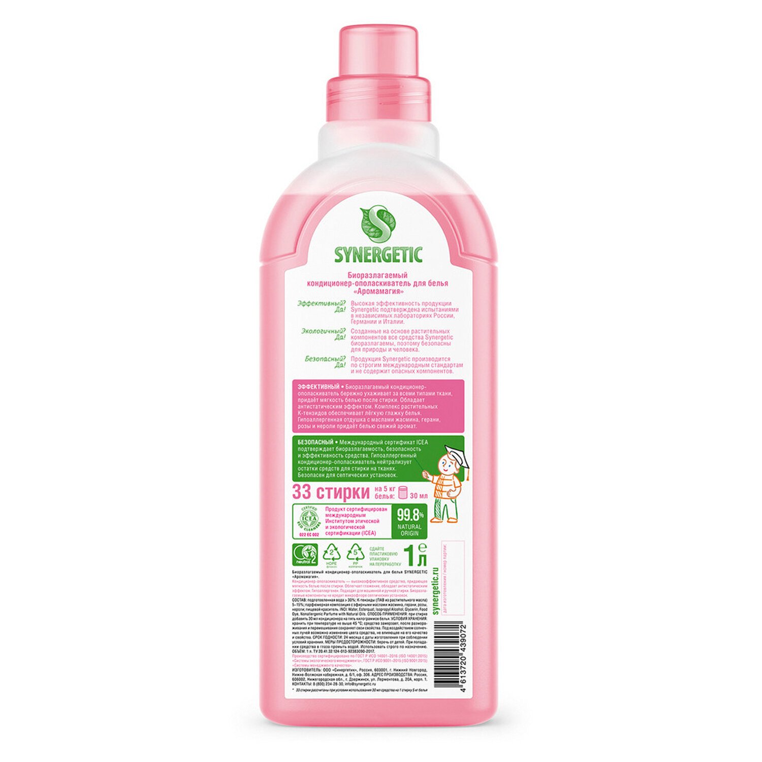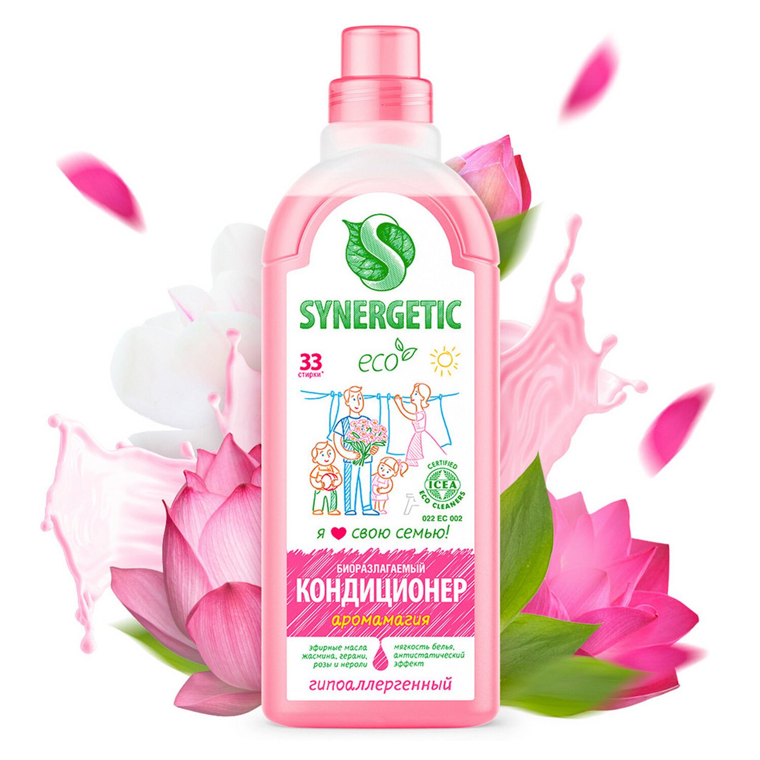 Биоразлагаемый кондиционер-ополаскиватель для белья SYNERGETIC "Аромамагия" – высокоэффективное средство, бережно ухаживающее за всеми типами ткани, в том числе деликатными, и придающее особую мягкость и нежность белью после стирки. Гипоаллергенный кондиционер-ополаскиватель нейтрализует остатки средств для стирки на ткани, помогает сохранить структуру ткани, защищая волокна от изнашивания и повреждения. Средство обладает антистатическим эффектом. Комплекс растительных К-тензидов обеспечивает легкую глажку белья после стирки и высыхания. Гипоаллергенная парфюмерная композиция с эфирными маслами жасмина, герани, розы и нероли придает белью нежный и приятный аромат. Подходит для ручной и машинной стирки, полностью выполаскивается из тканей. Международный экологический сертификат ICEA подтверждает биоразлагаемость, безопасность и эффективность средства. Биоразлагаемые компоненты не вредят микрофлоре септических установок.