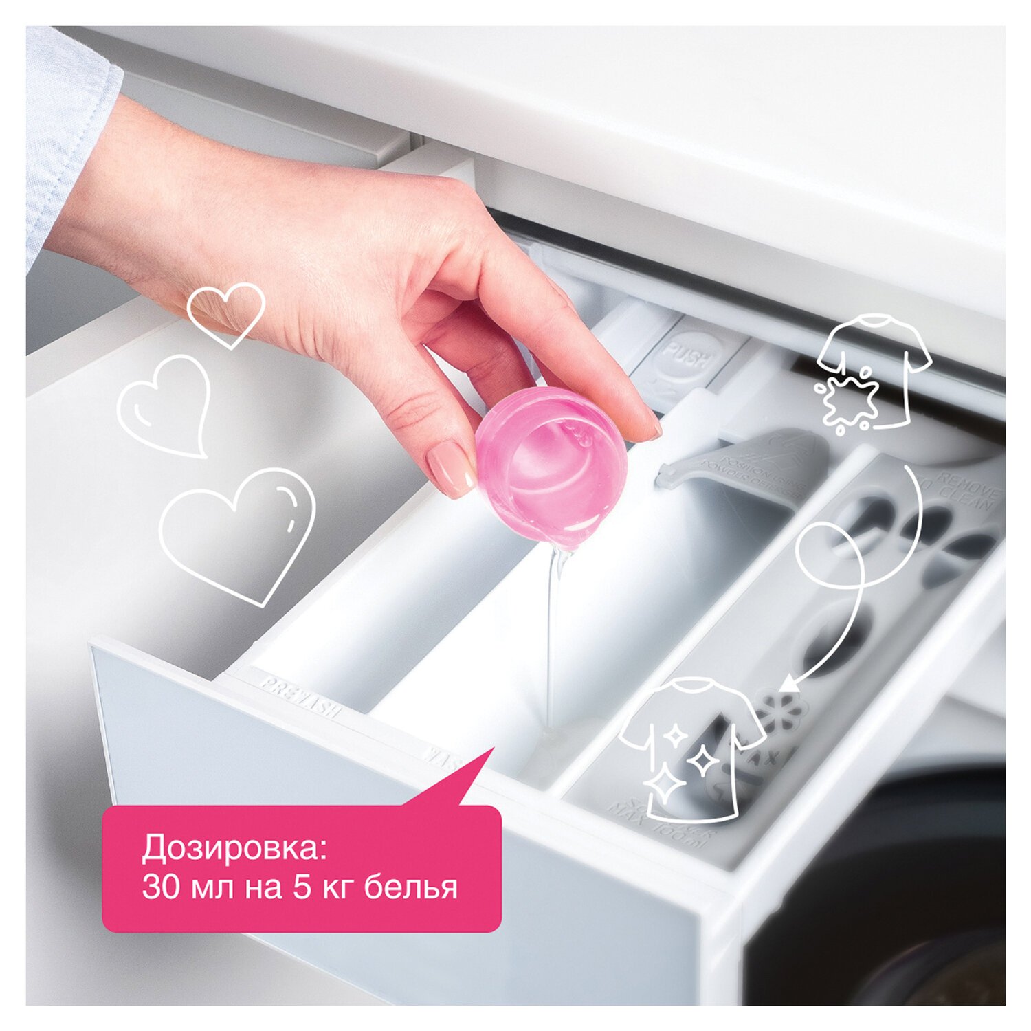 На 5 кг белья достаточно добавить 1 колпачок кондиционера (30 мл). Средство заливается в специальный отсек стиральной машины для использования во время последнего полоскания.