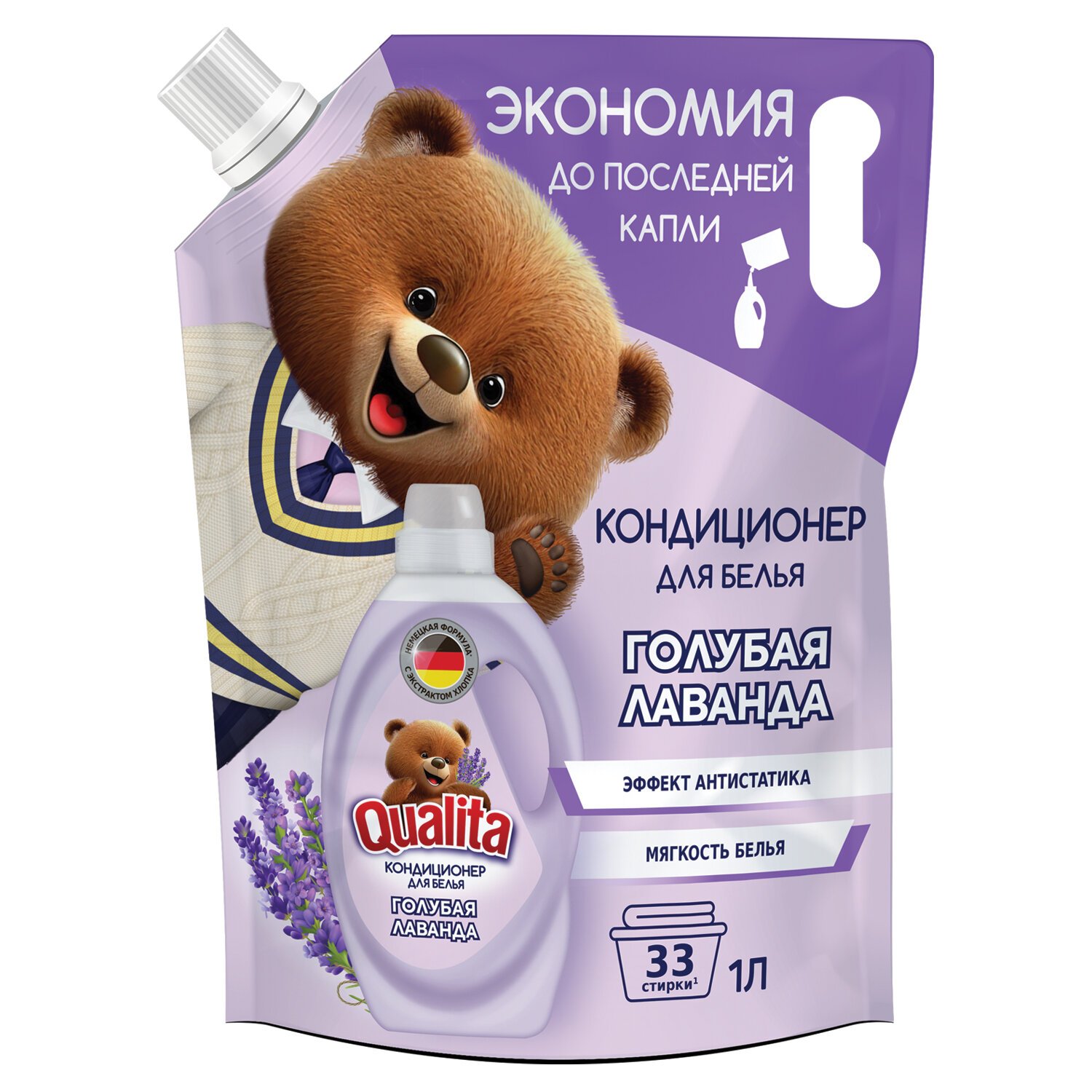 Кондиционер-ополаскиватель для белья 1л QUALITA "Голубая лаванда", с антистатиком, дой-пак, 14472