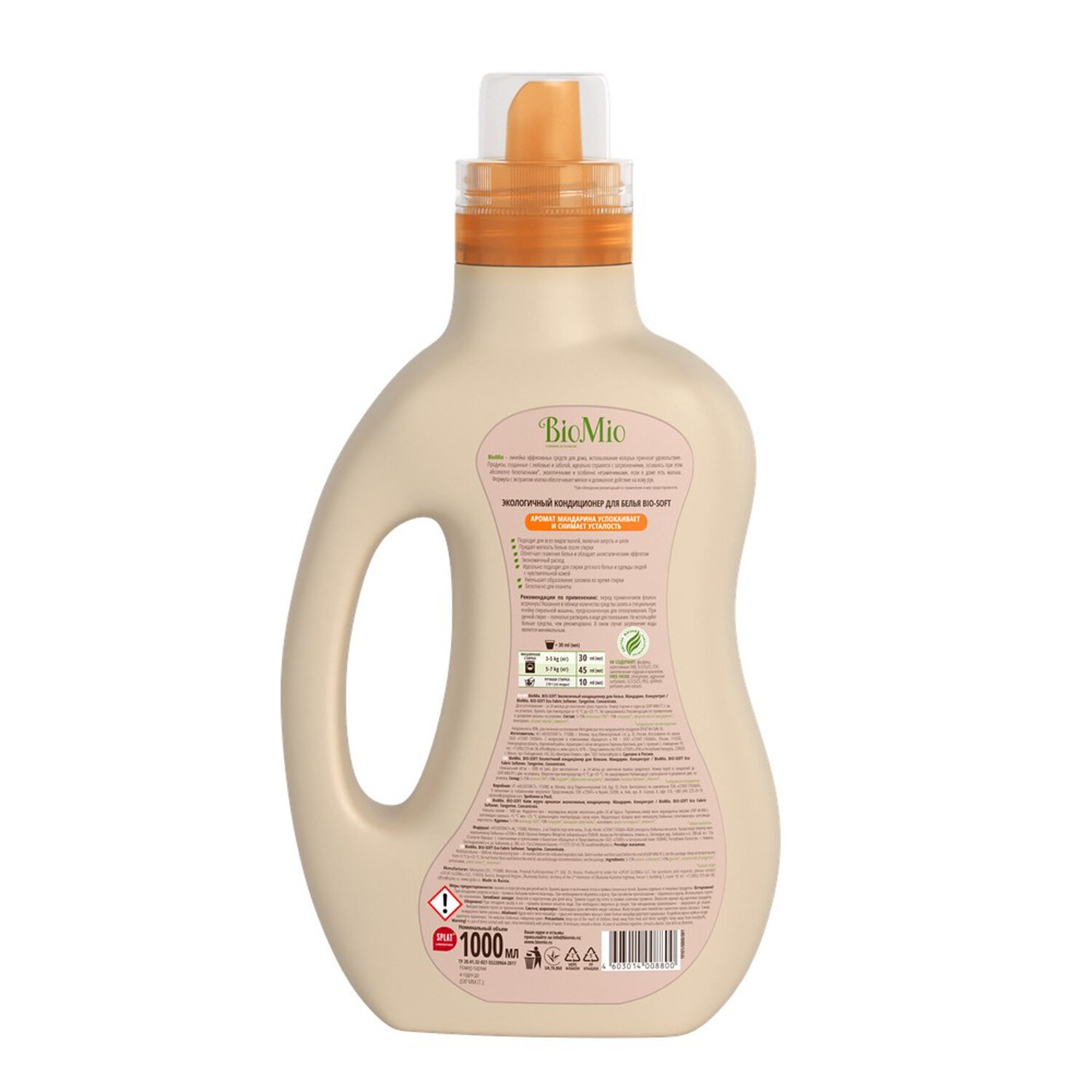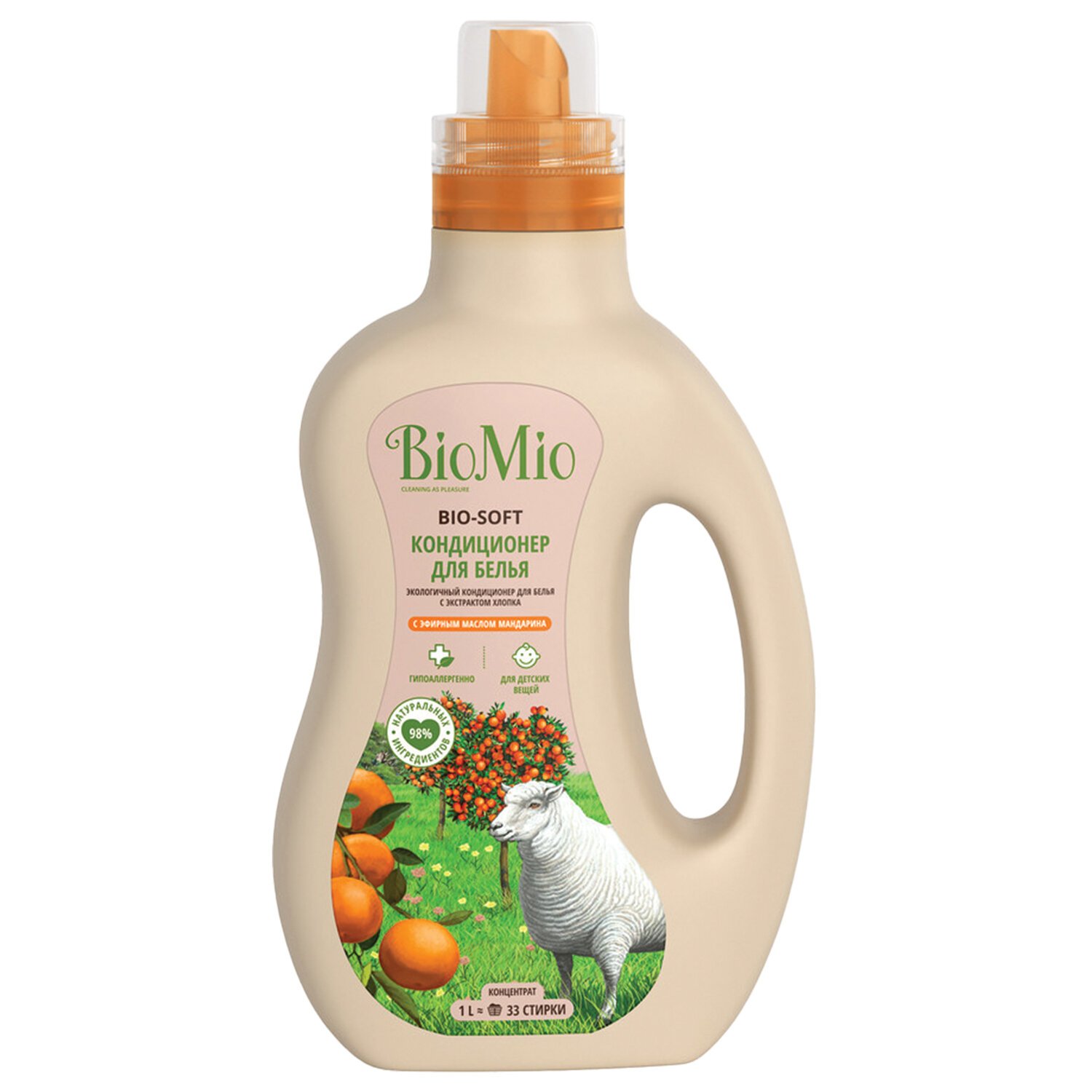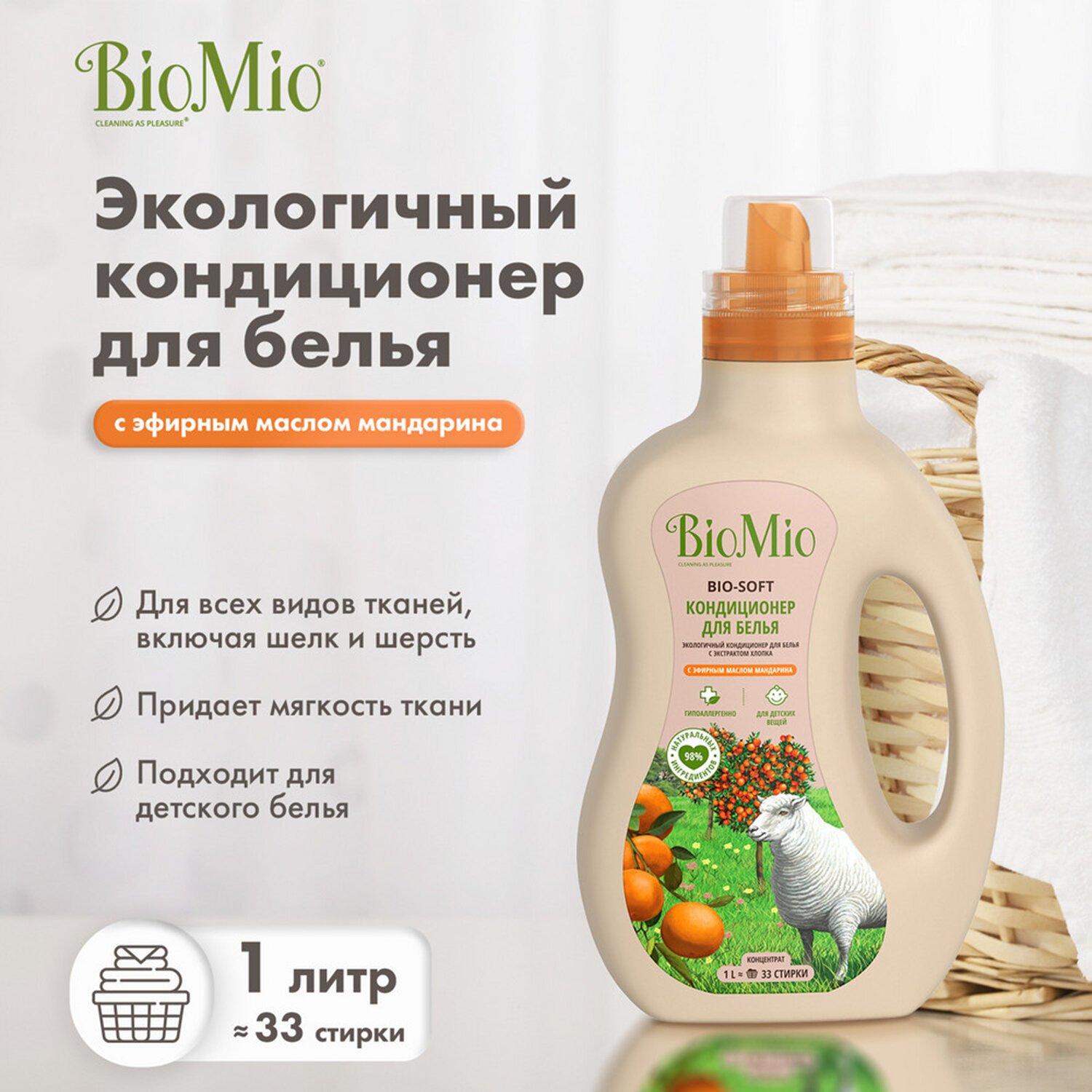 Экологичный гипоаллергенный кондиционер для белья BioMio с бодрящим маслом мандарина подходит для всех видов тканей, включая шелк и шерсть. Придает мягкость ткани и облегчает глаженье. Подходит для людей с чувствительной кожей, для стирки детского белья.