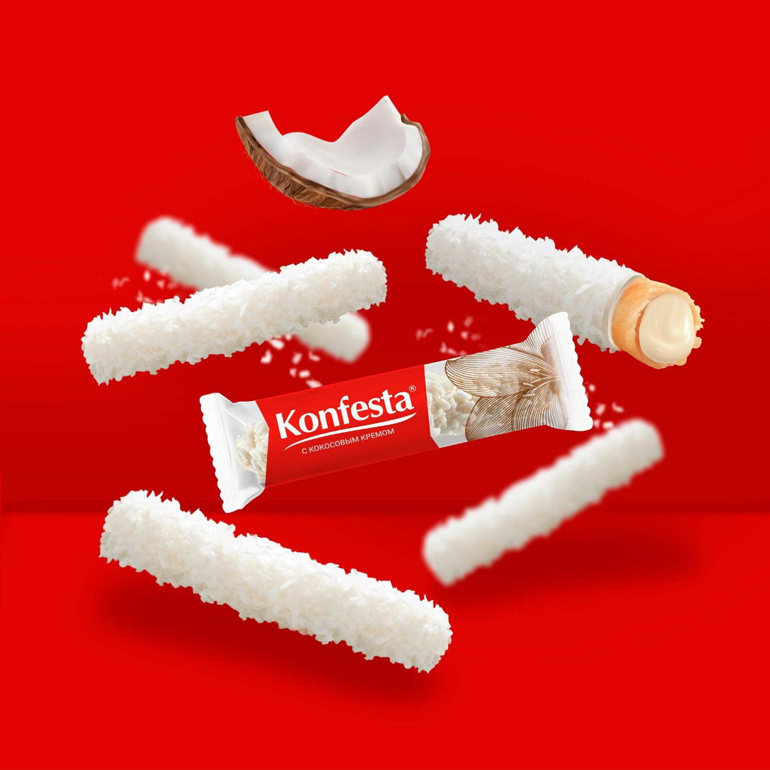 KONFESTA - вкусные лёгкие конфеты в форме трубочек, с нежным сливочным кремом в хрустящей вафле и обсыпке из ароматной кокосовой стружки.