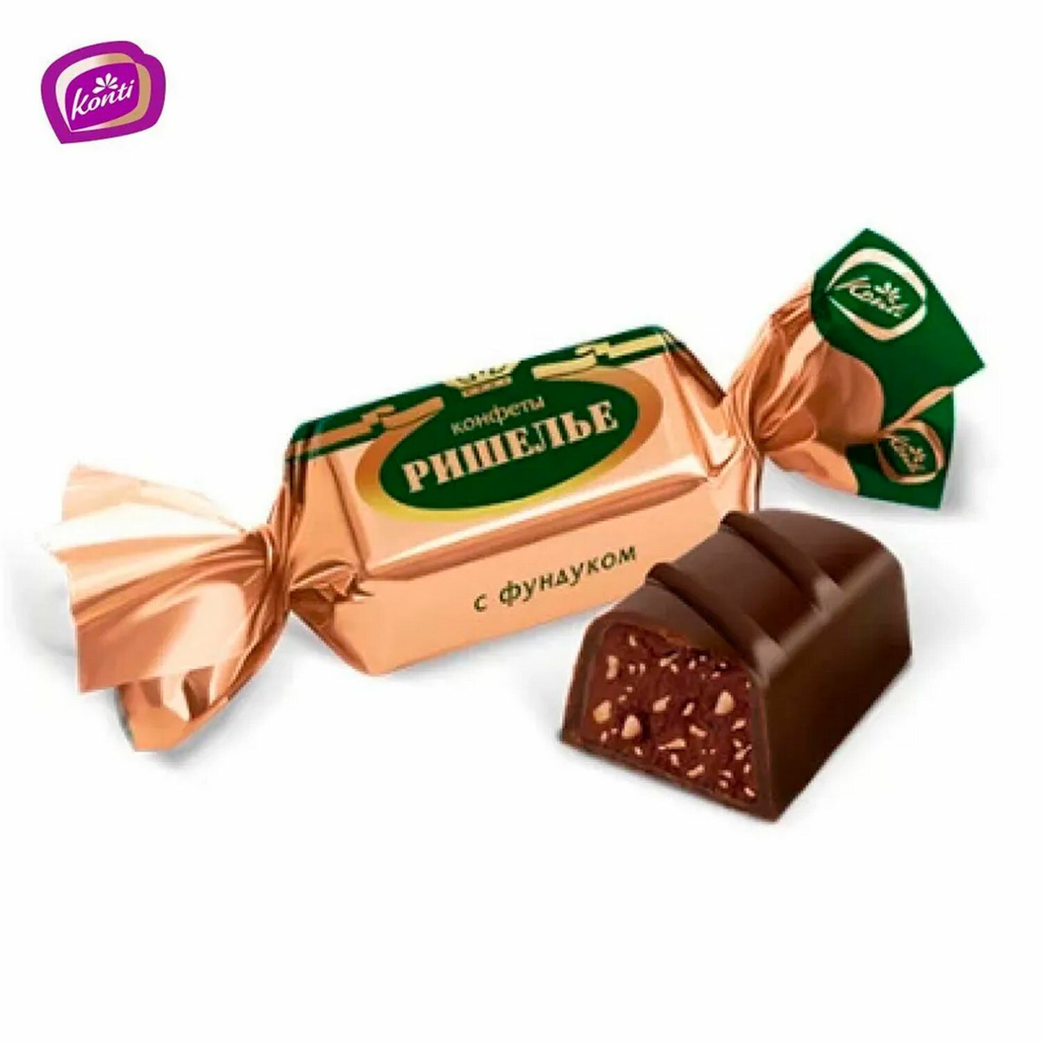 Роскошные отливные конфеты KONTI "Ришелье", наполненные нежной начинкой с дробленым фундуком.