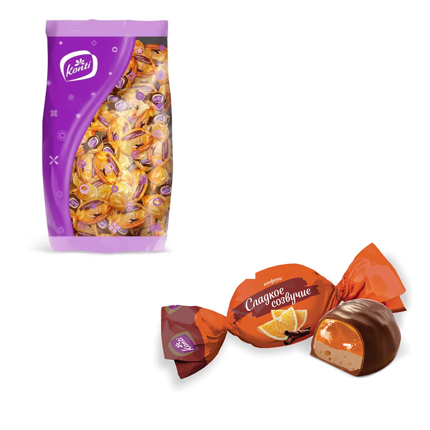 Оригинальные глазированные конфеты KONTI "Сладкое созвучие". Великолепное сочетание нежного суфле и ароматного желе со вкусом шоколада и апельсина.