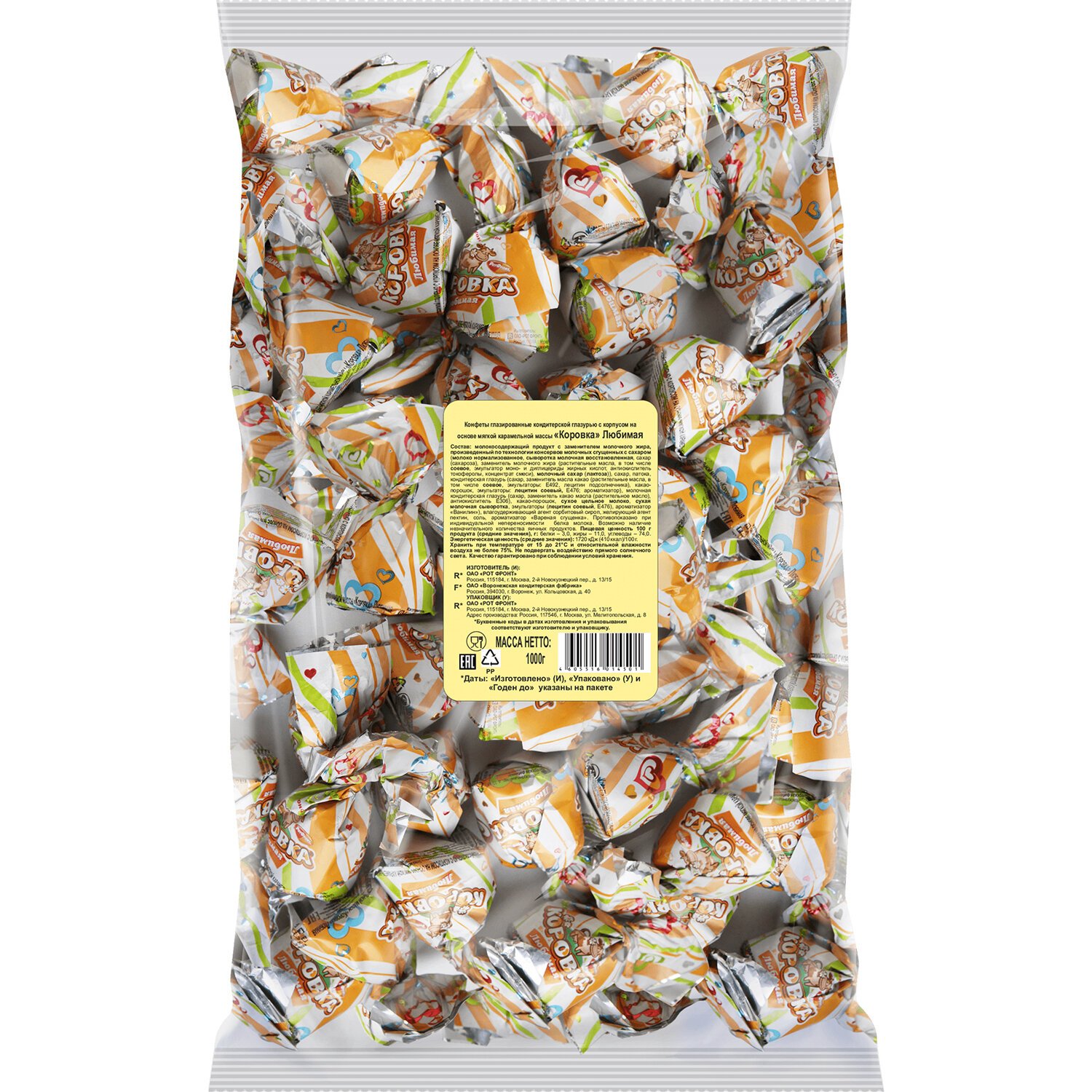 Конфеты шоколадные РОТ ФРОНТ "Коровка любимая", кремовая, 1000 г, пакет, РФ13338