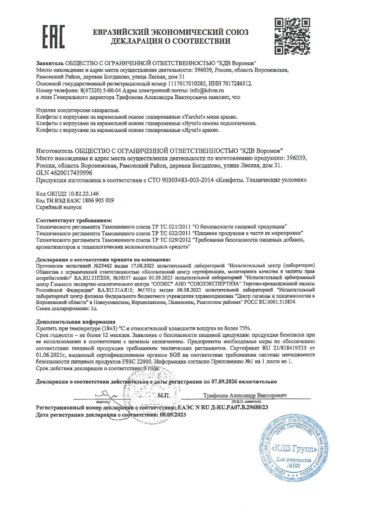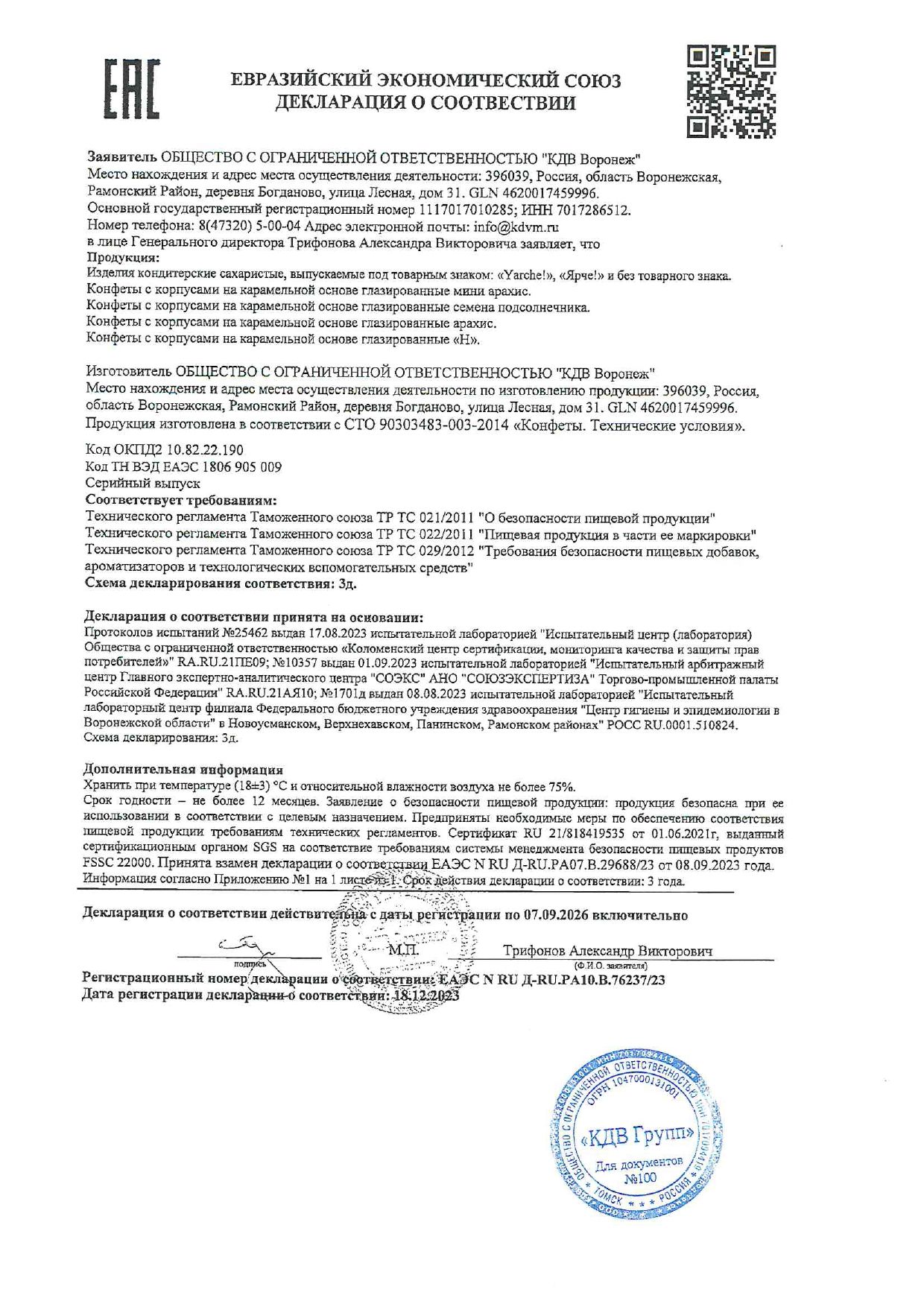 Состав: ядро арахиса жареное, патока, сахар, заменитель масла какао нетемперируемый лауринового типа (пальмоядровое масло, эмульгаторы: сорбитан тристеарат, соевый лецитин); масло пальмовое рафинированное дезодорированное, сыворотка сухая молочная деминерализованная, какао-порошок натуральный, эмульгатор: лецитин соевый; молоко цельное сгущенное с сахаром (молоко цельное, молоко обезжиренное, сахар (сахароза), лактоза); соль, ароматизаторы, эмульгатор (Е476). Может содержать следы глютена, яиц, орехов и продуктов их переработки.