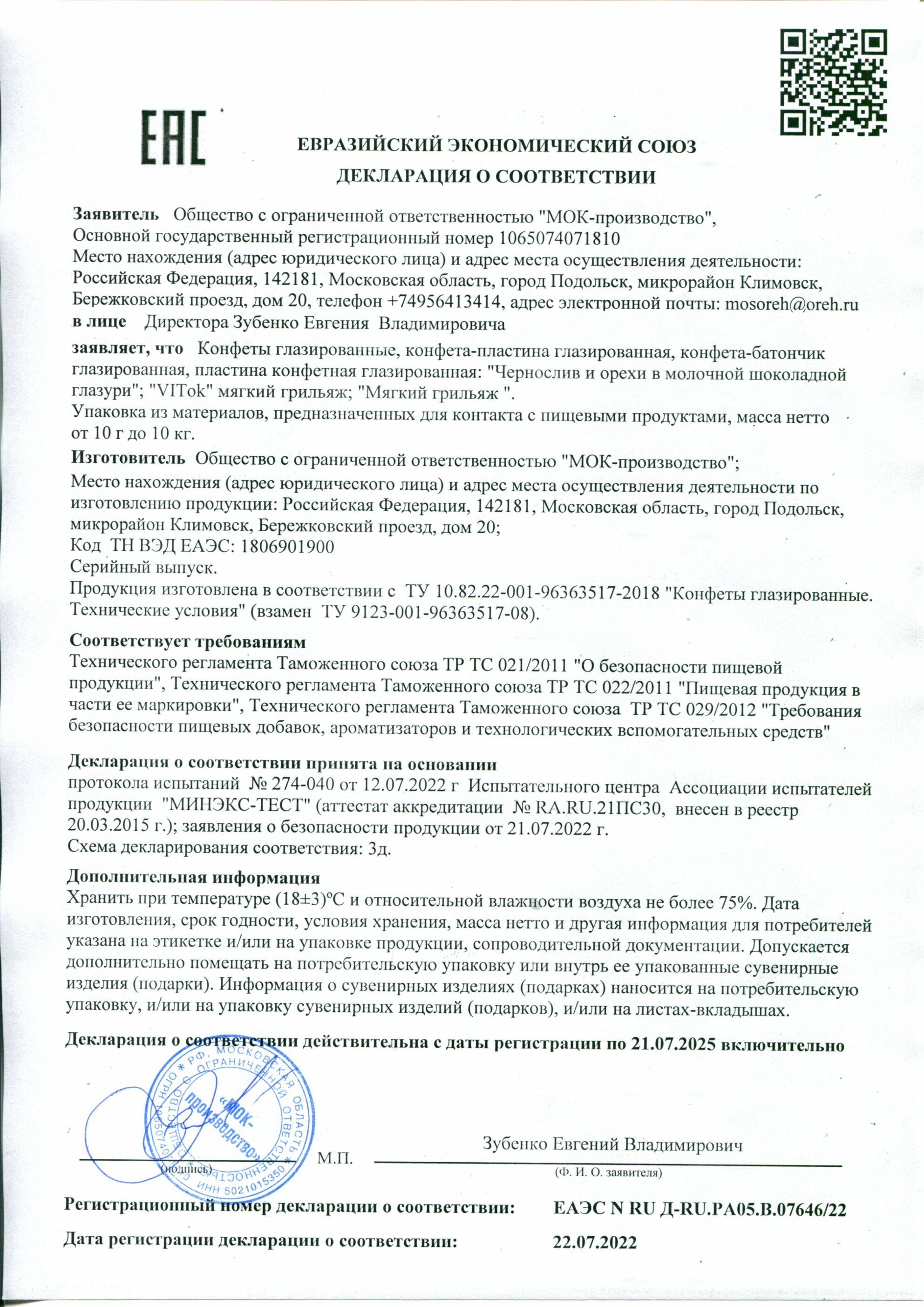 Состав: пюре сливовое, патока, молочная шоколадная глазурь (сахар, эквивалент масла какао (фракции масел растительных), тертое какао, молоко сухое цельное, какао-порошок, сыворотка молочная сухая, эмульгаторы: соевый лецитин и Е476; ароматизатор «Ванилин»), чернослив сушёный резаный, ядра фундука жареные дробленые, ядра миндаля жареные дробленые, масло кокосовое, продукт экструдированных круп молотый рисовый, экстракт сухой – рябина красная плоды (мальтодекстрин; экстракт рябины красной водный), эмульгатор соевый лецитин.Продукт готов к употреблению. В редких случаях продукт может содержать мелкие фрагменты косточки.