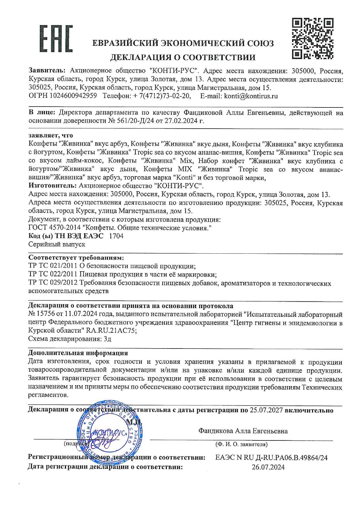 Состав: сахар, патока крахмальная кукурузная, сироп глюкозно-фруктозный, агент влагоудерживающий сорбит, агент желирующий Е 407, регуляторы кислотности (кислота молочная, кислота лимонная, цитрат натрия), комплексная пищевая добавка глазирователь «Капол» (глазирователь (5-12%) Е 903, антиокислитель Е 307, регулятор кислотности Е 330), красители (Е 141(ii), Е 160а, Е 120), агент желирующий пектин, ароматизатор, сок арбуза концентрированный.