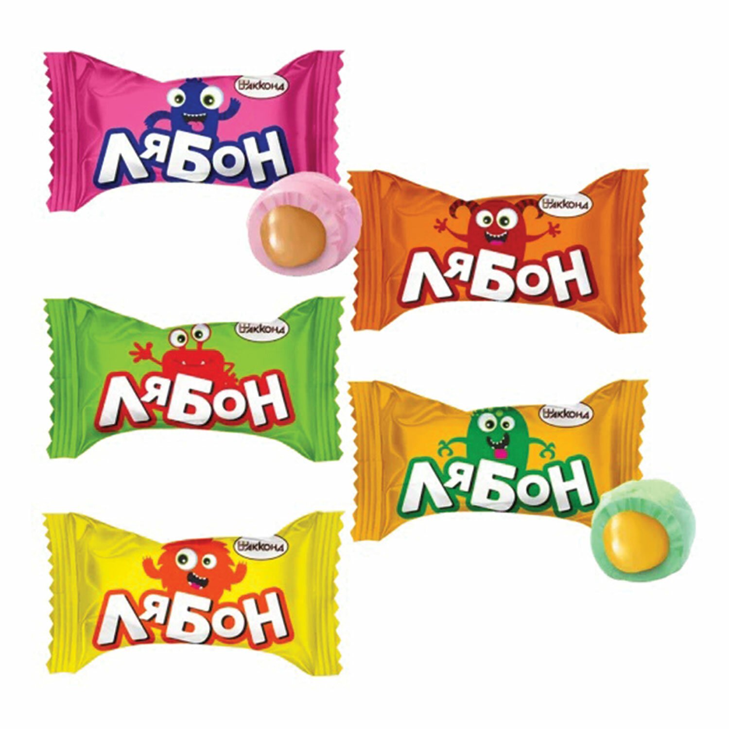 Мягкая жевательная карамель АККОНД "ЛяБон", состоящая из фруктово-ягодного корпуса и привлекательных начинок: яблоко-дыня, малина-сгущенка, арбуз.