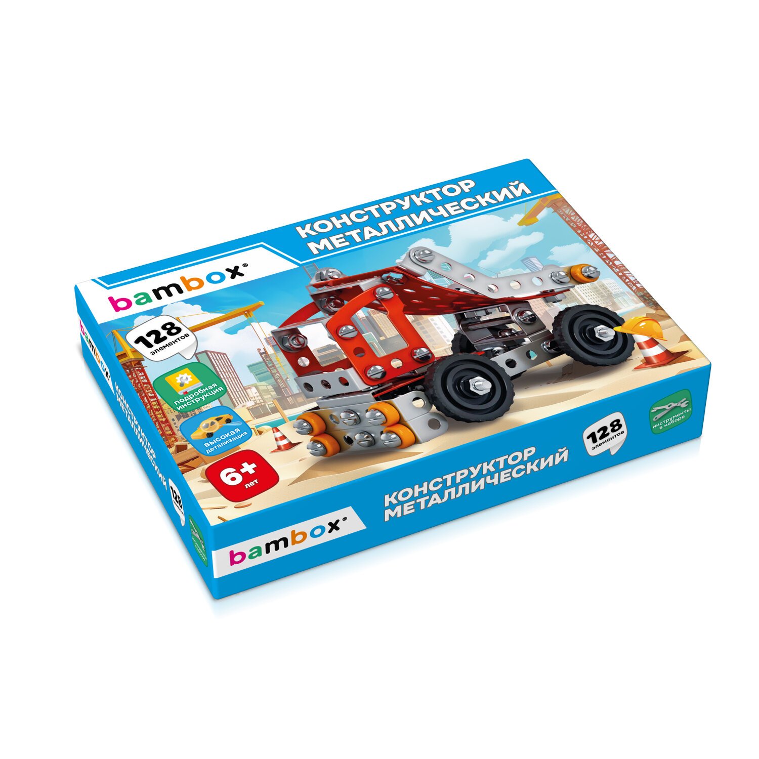 Комплектация набора: 128 элементов, гаечный ключ, отвертка, пошаговая инструкция по сборке.