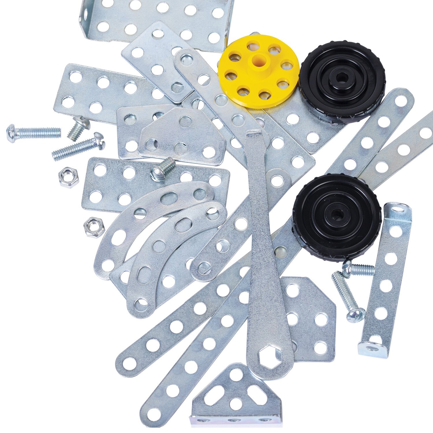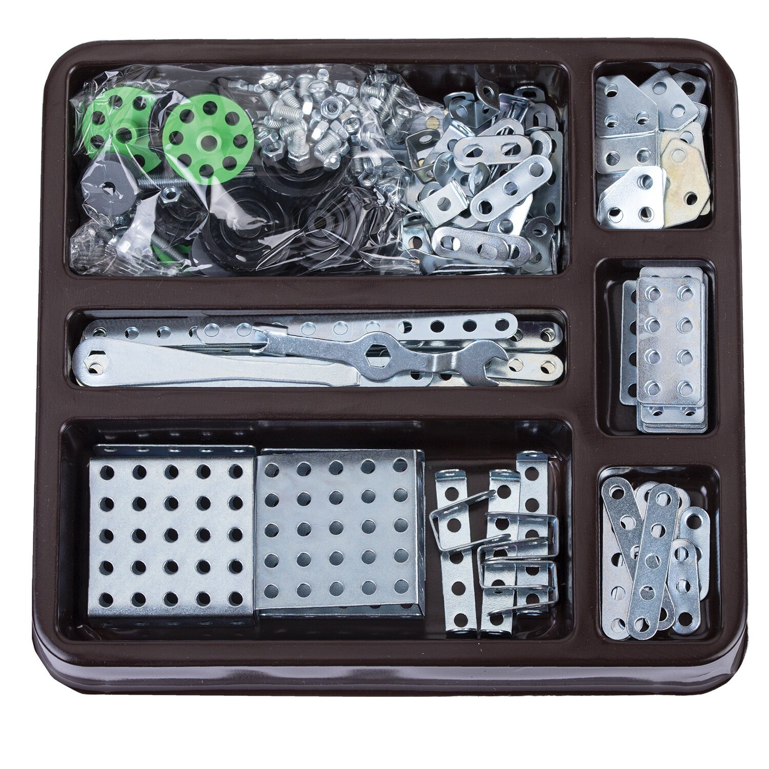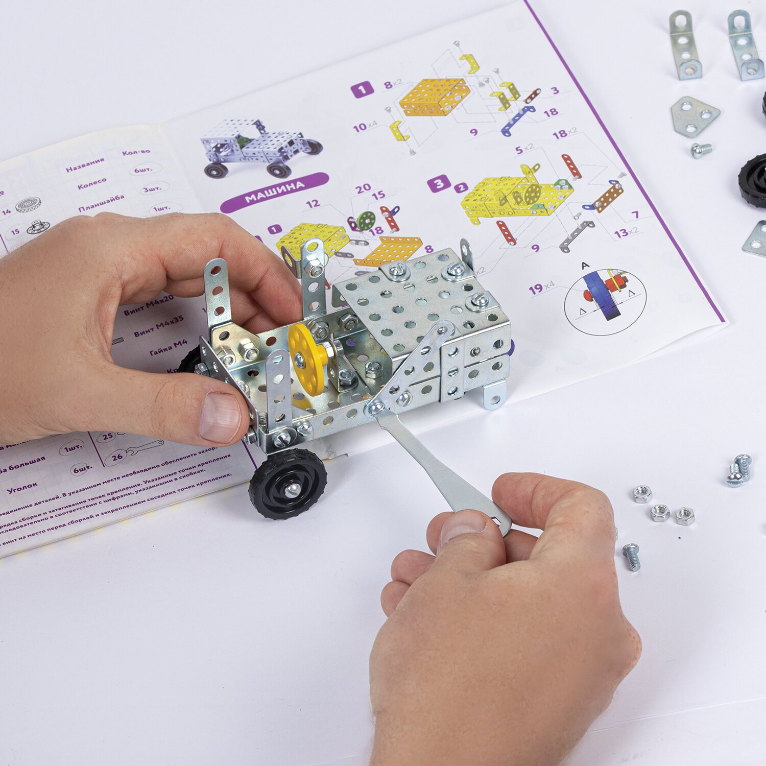 Для удобства в набор входит подробная иллюстрированная инструкция с пошаговыми рекомендациями по сборке 5 разных моделей, которая познакомит начинающего мастера с азами сборки. Начальный уровень сложности сборки предусмотрен для детей младшего и среднего школьного возраста. Элементы конструктора выполнены из металла и пластика. Также в набор входят пластиковые детали. Поставляется в картонной упаковке.