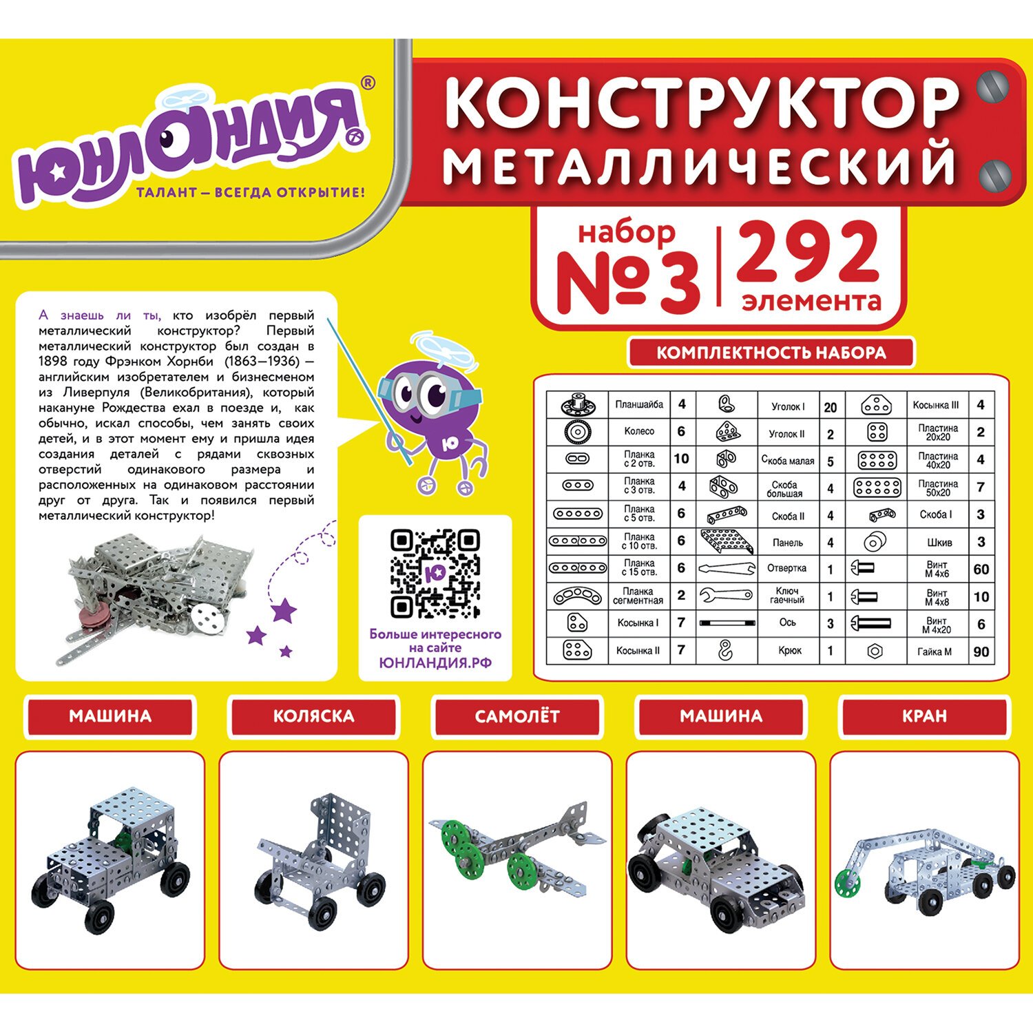 Конструктор металлический ЮНЛАНДИЯ "Для уроков труда №3", развивающий, 292 элемента, 104681