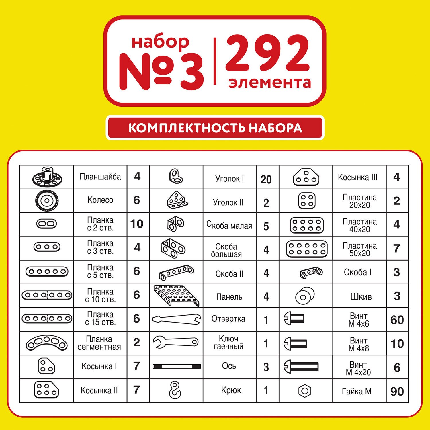 В комплект входят 292 элемента, среди которых есть подвижные детали, позволяющие собрать бесчисленное количество моделей. Комплектация: детали – 290 шт., ключ гаечный – 1 шт., отвертка – 1 шт., инструкция по сборке.