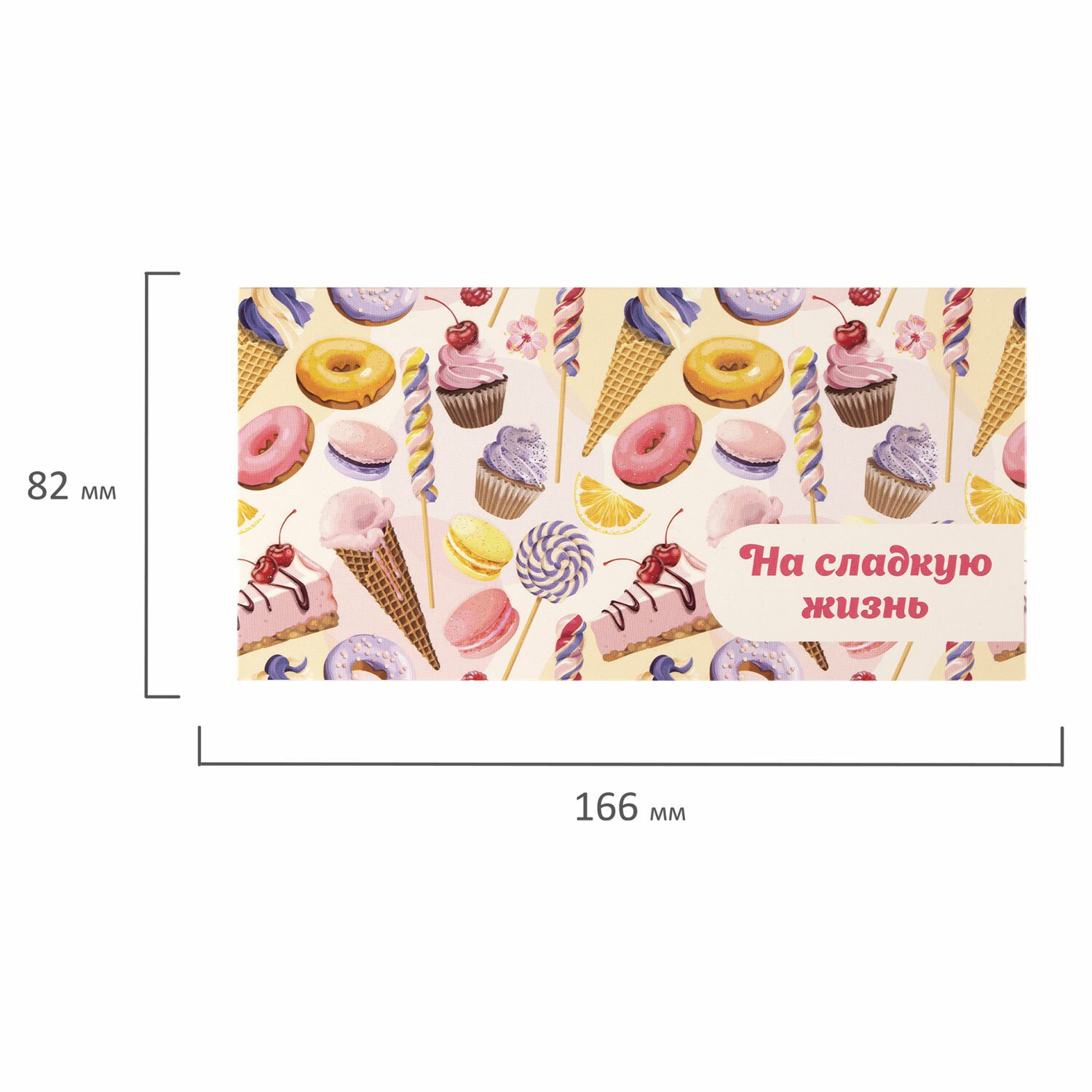Конверт с надписью "НА СЛАДКУЮ ЖИЗНЬ!" изготовлен из высококачественного картона плотностью 215 г/м2. Выполнен в светлых тонах с изображением сладостей. Отделка - блестки. Размер - 166х82 мм.
